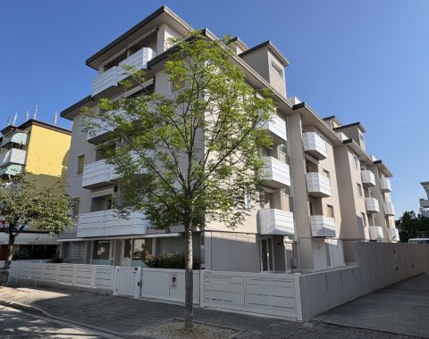 Gebäude in einer ruhigen und zentraler Lage von Sabbiadoro, nur 150 Meter vom Meer entfernt. Geräumige Dreizimmerwohnungen mit Terrasse und nummeriertem Parkplatz.