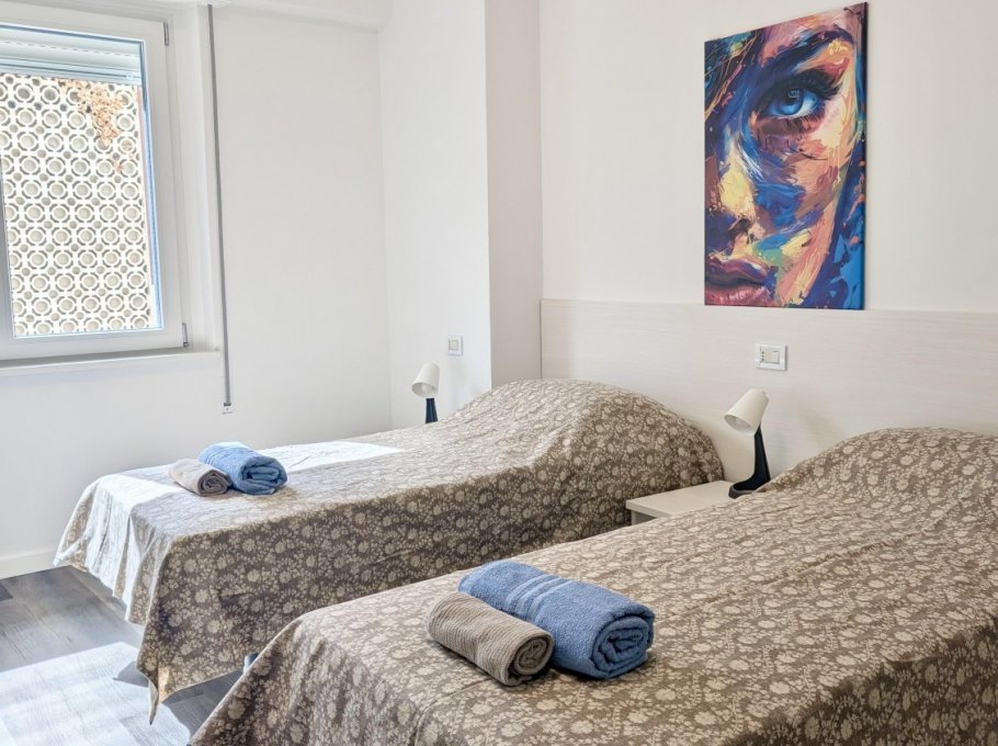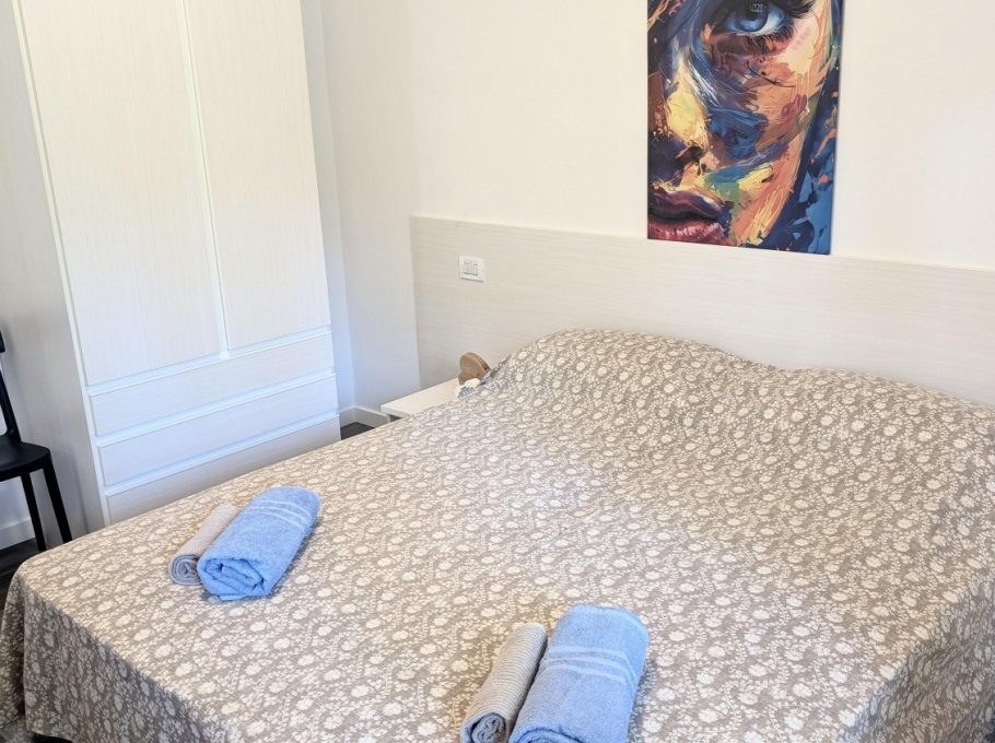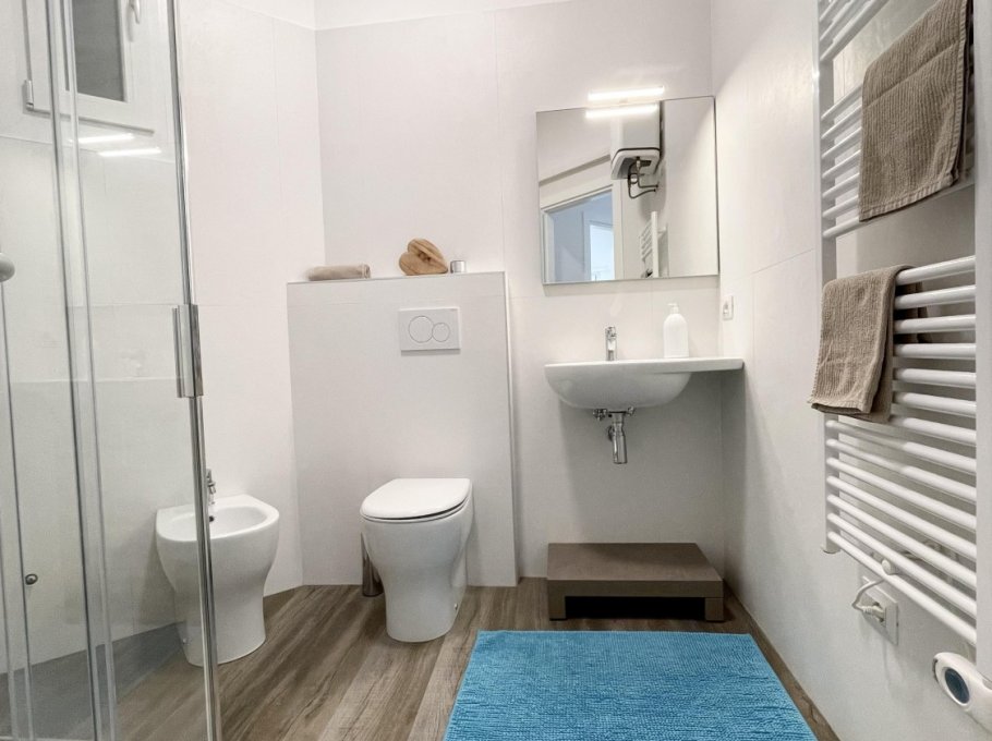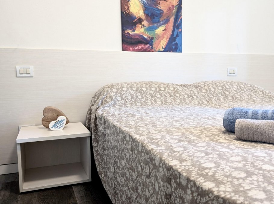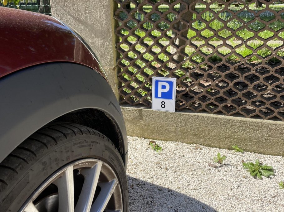 Dreizimmerwohnung im ersten Stock mit Balkon und Parkplatz. Die Wohnung besteht aus zwei Schlafzimmern, eigenem Bad, Wohnzimmer mit Doppelschlafcouch, Kochnische und gemeinsamer Waschküche.