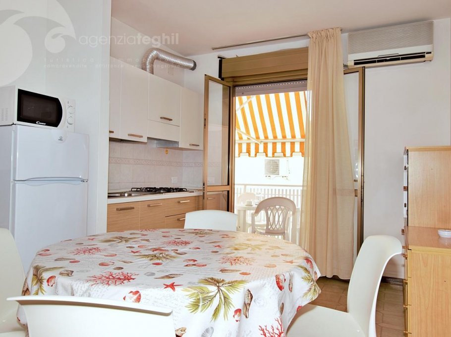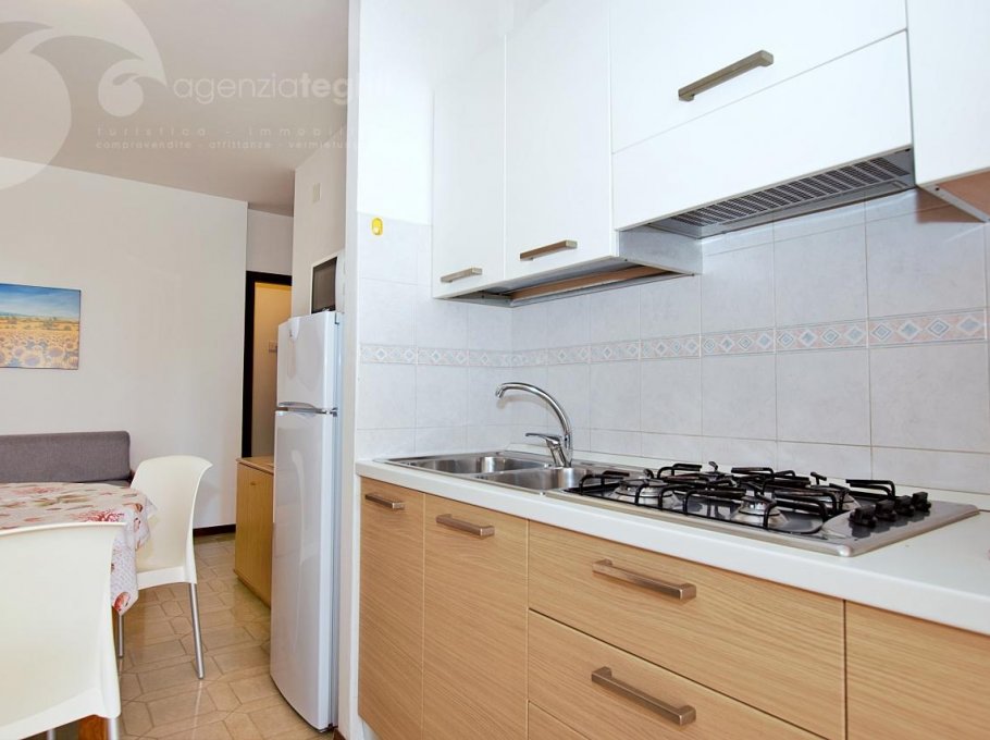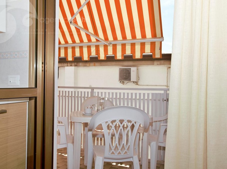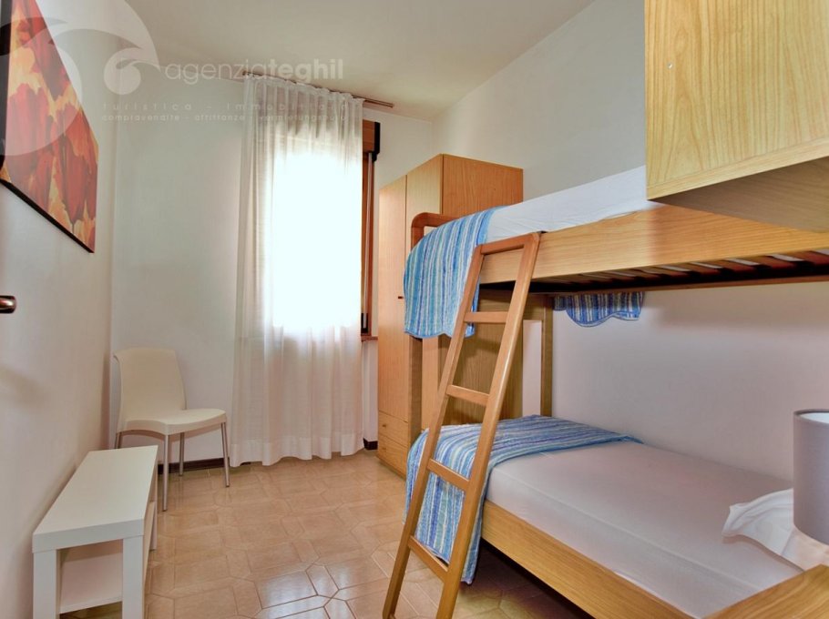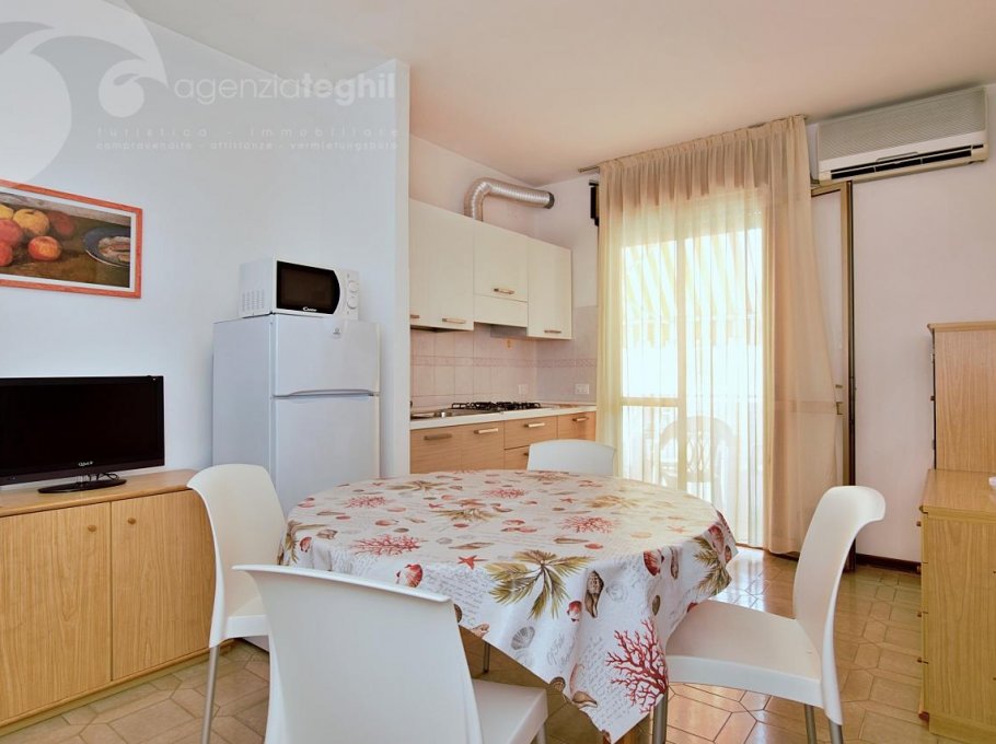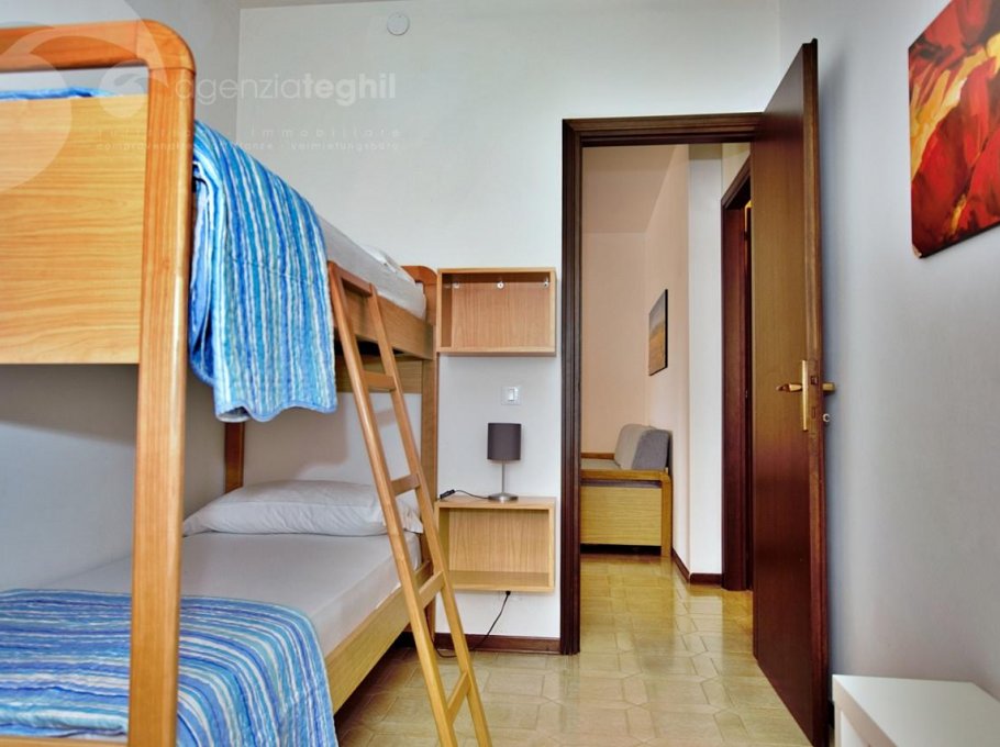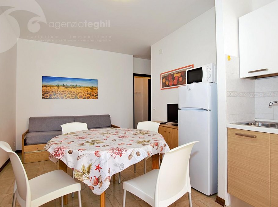 Typ C: 5/6 Personen - Appartement im 1. Stock (ohne Aufzug), der ein Dreibettzimmer, ein Zimmer mit Etagenbett, Badezimmer mit Duschkabine und Fenster, Wohnzimmer mit Schlafcouch, Fernseher mit Sat-Anschluss, eine Küchenzeile mit Kühlschrank 240 lt (separatem Gefrierfach) und Mikrowelle. Terrasse mit Tisch und Stühlen und Markise.