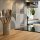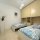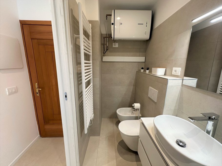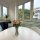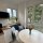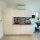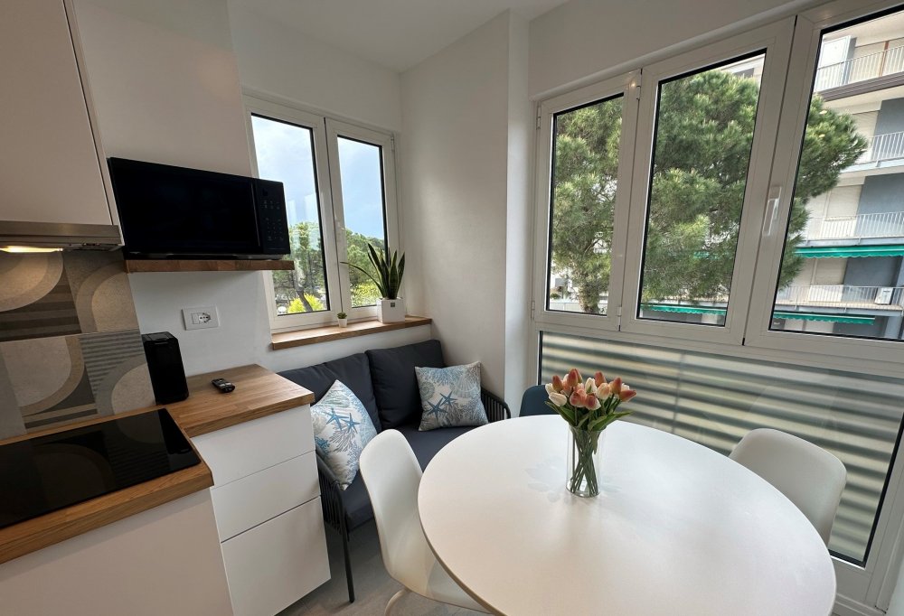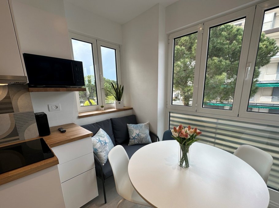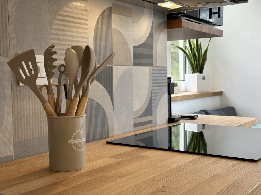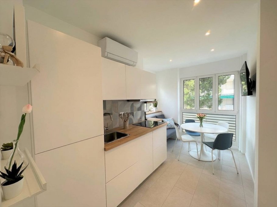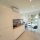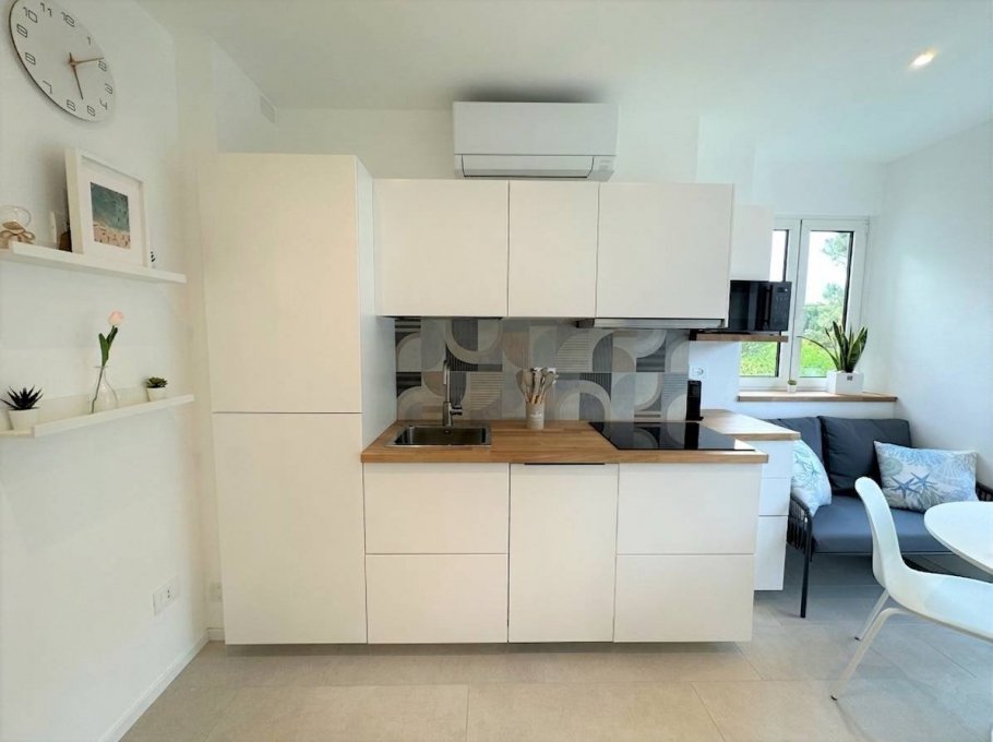 Die Wohnung öffnet sich zu einem hellen Wohnbereich mit einer modernen und funktionalen Küche, ausgestattet mit Induktionskochfeld, Einbaumikrowelle, kleinem Kühlschrank mit Gefrierfach, Waschmaschine und Geschirrspüler.