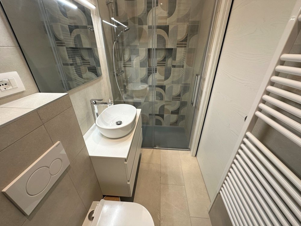 Modernes Badezimmer mit Dusche und einem einzigartigen, platzsparenden Wäscheständer an der Wand.