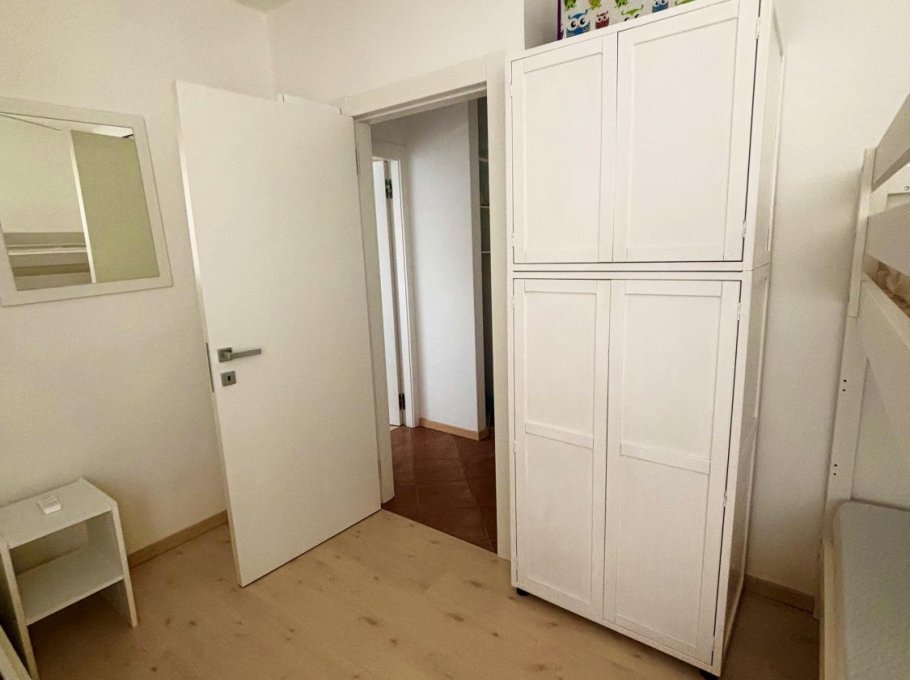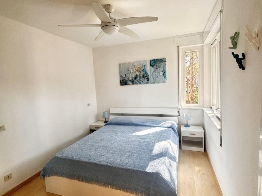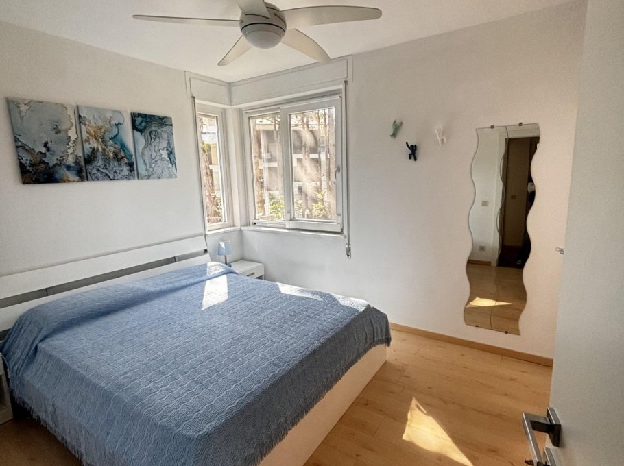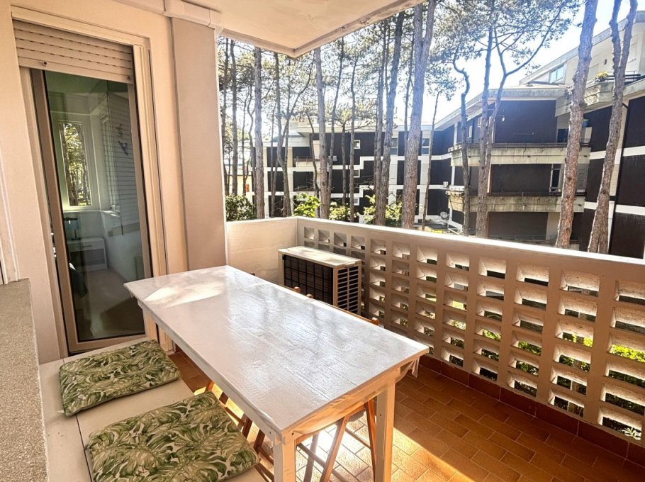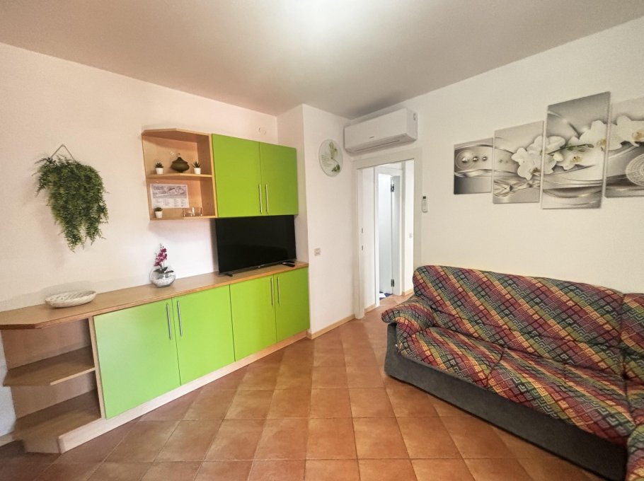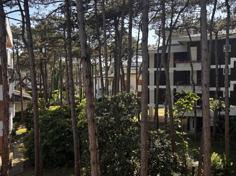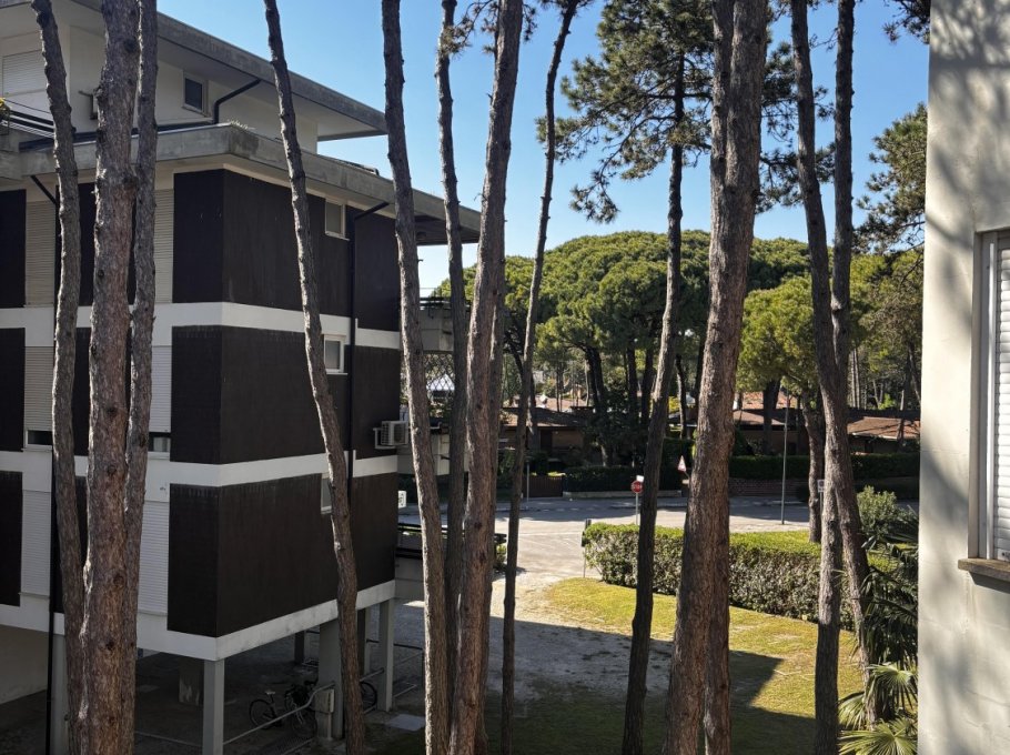 Apartment im zweiten Stock eines kleinen Gebäudes, umgeben vom Grün der Lignano Riviera.