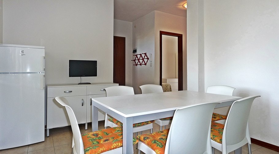Typ C: 4/5 Personen – Wohnung im 2. Obergeschoss (ohne Aufzug) mit moderner Einrichtung. Sie besteht aus einem Schlafzimmer mit Doppelbett und Terrasse, einem Schlafzimmer mit zwei Einzelbetten und Terrasse, einem Badezimmer mit Fenster und Dusche (Duschvorhang), einem Wohnzimmer mit Schlafcouch, Fernseher und einer Terrasse mit Tisch und Stühlen. Eine separate Küchenzeile mit einem 240-Liter-Kühlschrank (separates Gefrierfach) ist ebenfalls vorhanden.