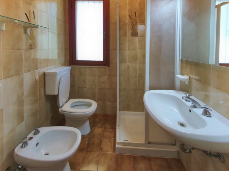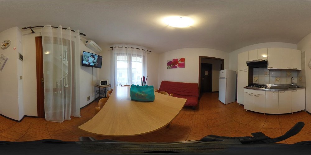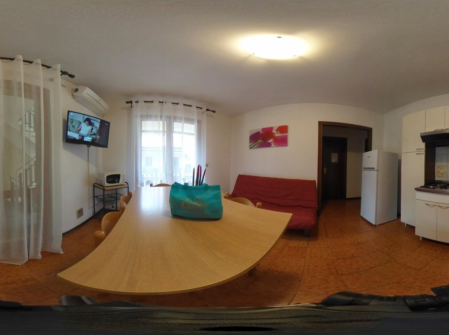Diese Wohnung besteht aus einem Wohnraum mit Kochecke und einer Couch, Tv und Mikrowelle, einem Zweibettzimmer, einem Dreibettzimmer (ein Doppelbett und ein Einzelbett), einem Badezimmer mit Duschkabine/Bidet/Wc und zwei geraeumigen Balkone, davon einer mit Tisch und Stuehlen. Klimaanlage, Wi-fi und Endreinigung sind im Preis inbegriffen. In den Mietbestimmungen der Agentur sind die Modalitaeten der obengenannten Dienste erklaert. Groesse des nummerierten Autoabstellplatzes: 3,10x4,50x3,00