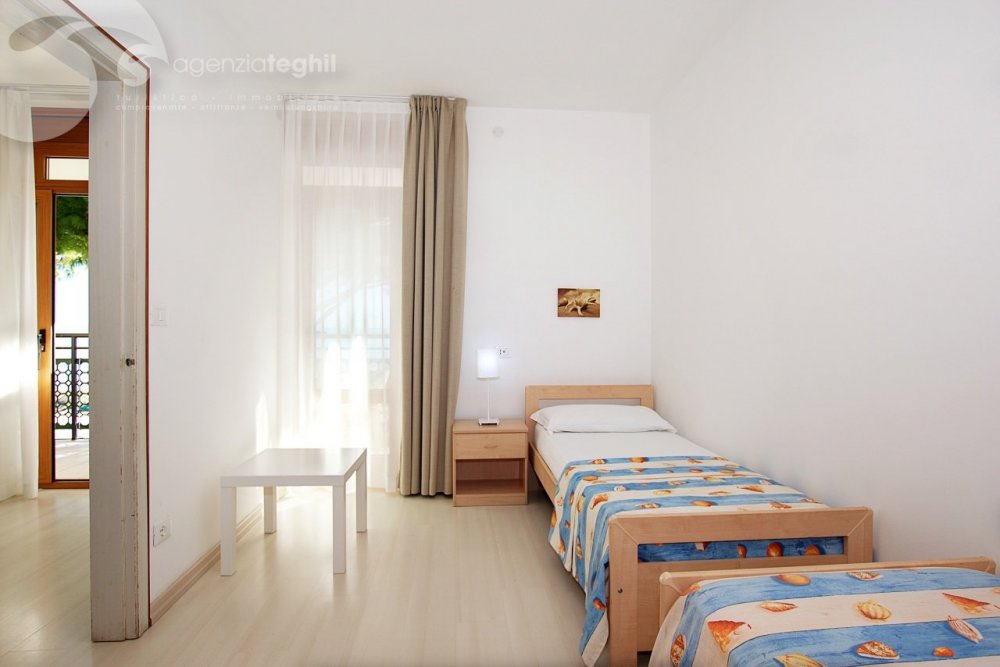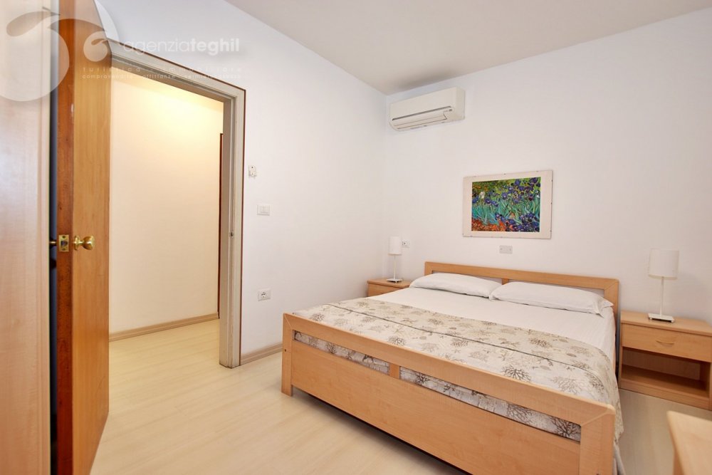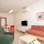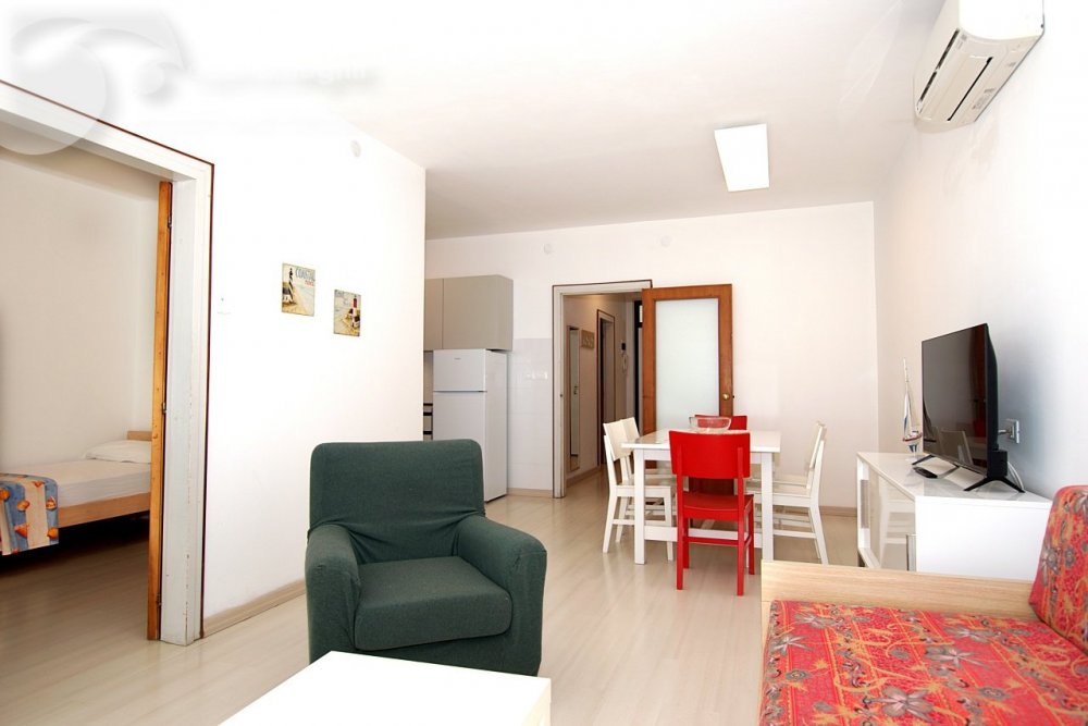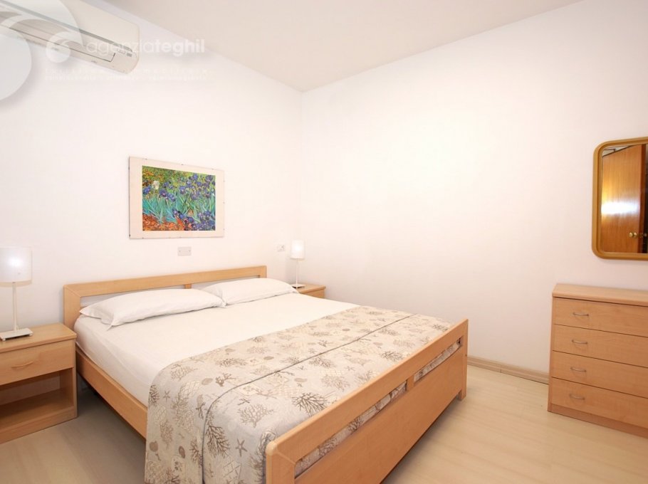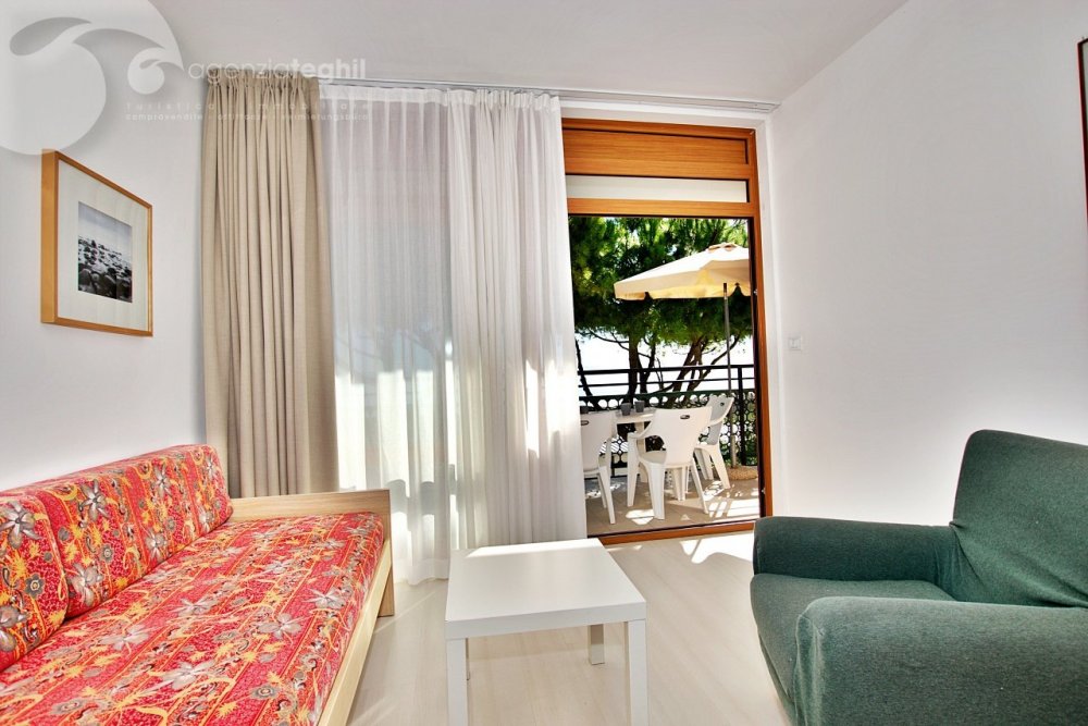 Typ C: 4/5 Personen – Renovierte Wohnung im ersten Stock, bestehend aus einem Schlafzimmer mit Doppelbett, einem Schlafzimmer mit zwei Einzelbetten und Terrasse, einem geräumigen Wohn-/Esszimmer mit Schlafcouch und Terrasse mit Meerblick, Sonnenschirm, Gartentisch und Stühlen, einer Küchenzeile mit Waschmaschine, Geschirrspüler, Induktionskochfeld, Mikrowelle und 240-Liter-Kühlschrank mit Doppeltür sowie einem Badezimmer mit Fenster und Duschkabine.
