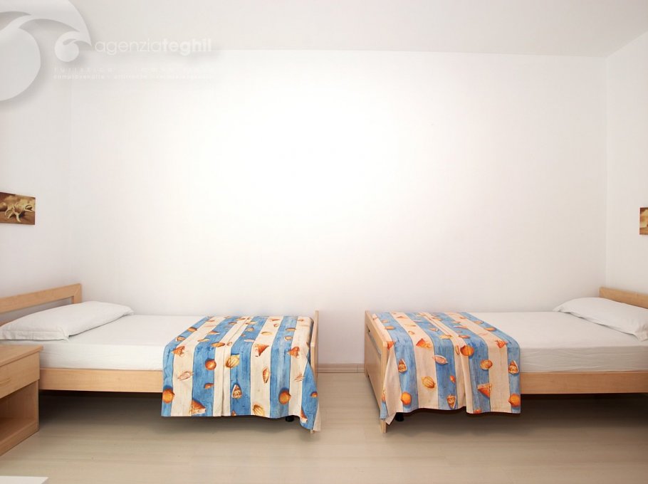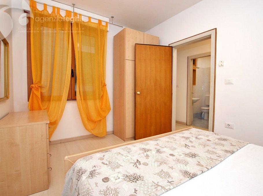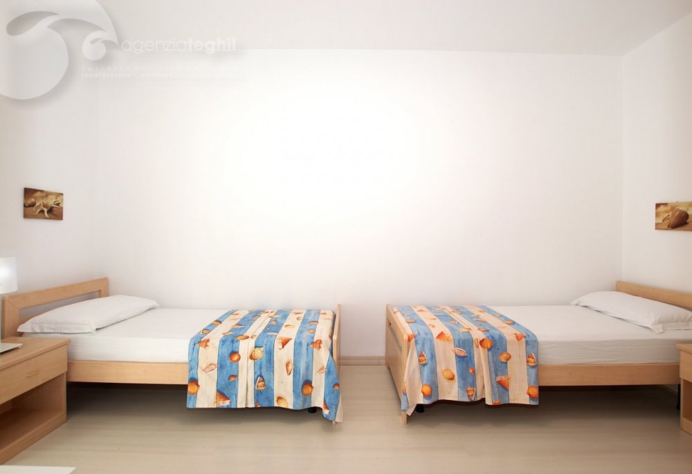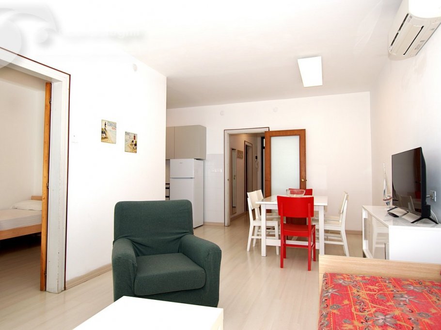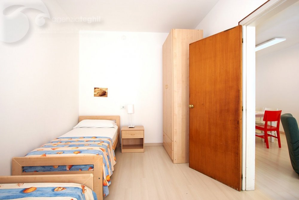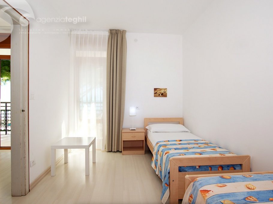 Typ C: 4/5 Personen – Renovierte Wohnung im ersten Stock, bestehend aus einem Schlafzimmer mit Doppelbett, einem Schlafzimmer mit zwei Einzelbetten und Terrasse, einem geräumigen Wohn-/Esszimmer mit Schlafcouch und Terrasse mit Meerblick, Sonnenschirm, Gartentisch und Stühlen, einer Küchenzeile mit Waschmaschine, Geschirrspüler, Induktionskochfeld, Mikrowelle und 240-Liter-Kühlschrank mit Doppeltür sowie einem Badezimmer mit Fenster und Duschkabine.