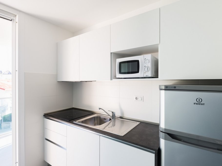 Typ E. Wohnschlafraum mit Kochecke und Doppelcouch, Doppelzimmer, Duschkabine/Wc und moeblierte Balkon. Max 4 Pax.