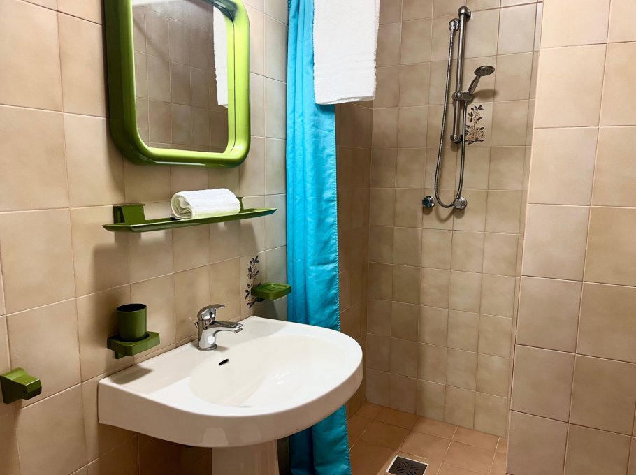 Typ A. Wohnschlafraum mit Kochecke und Doppelcouch, Dusche/Wc und möblierte Balkon. Max 2 Pax.