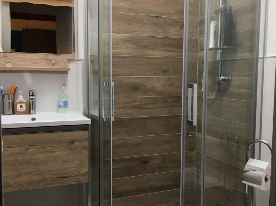 Wohnraum mit Kochecke und Einzelschlafcouch, Doppelschlafzimmer, Bad mit Duschbox. Klimaanlage, Mikrowelle, TV, Induktionsherd, nicht überdachter Autoabstellplatz.