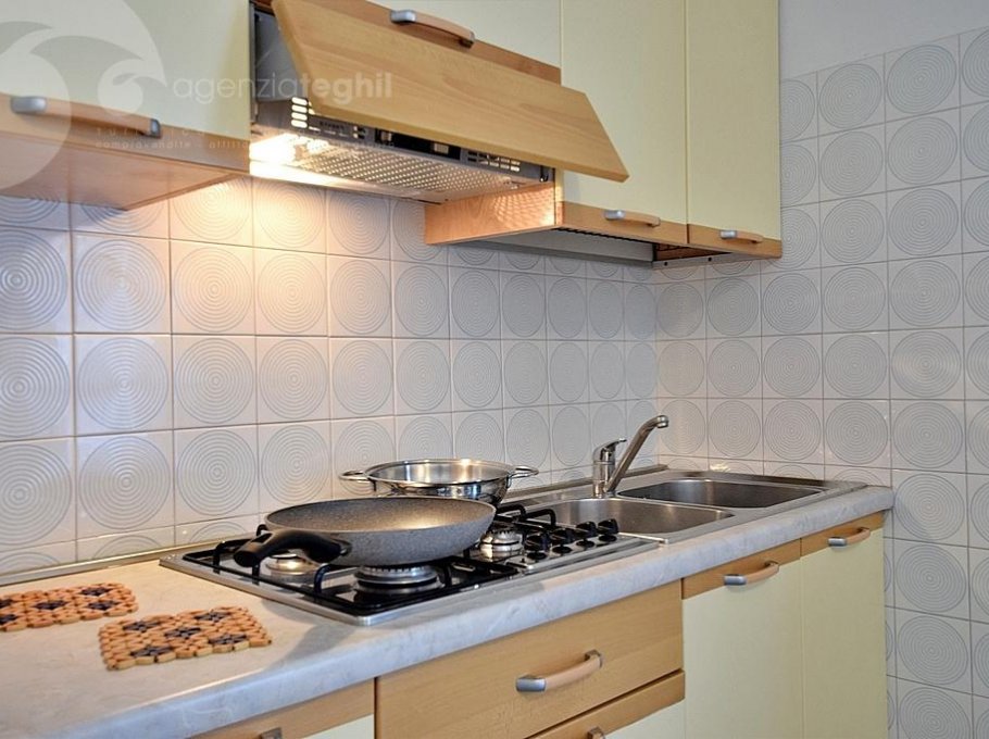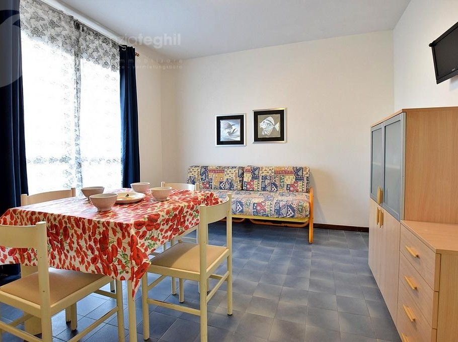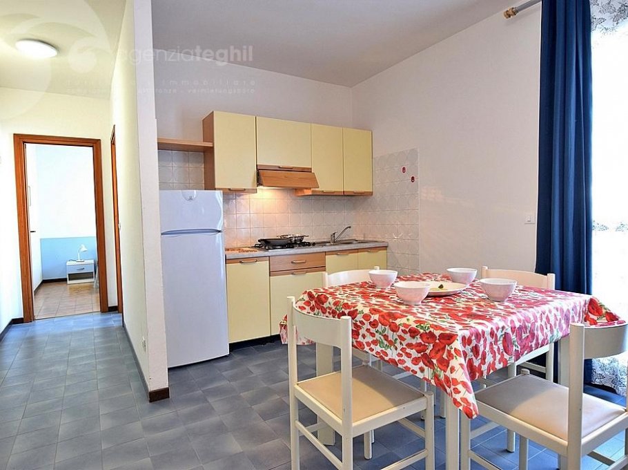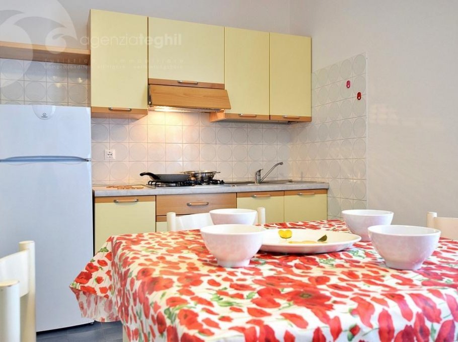 Typ B: 2/4 Personen - Wohnung im 1. Stock bestehend aus einem Doppelzimmer mit Terrasse, einem Badezimmer mit Fenster und Duschkabine, einem Wohnzimmer mit Doppelschlafsofa, Sat-TV und einer Terrasse (ohne Meerblick) mit Tisch und Stühlen im Freien Küchenzeile mit 240 l Kühlschrank (separates Gefrierfach). Die Wohnung ist auch klimatisiert, Safe.