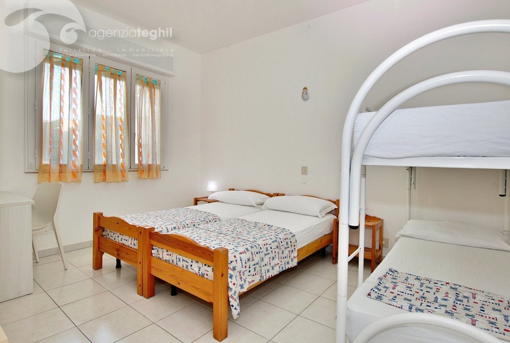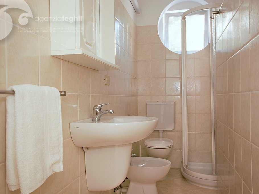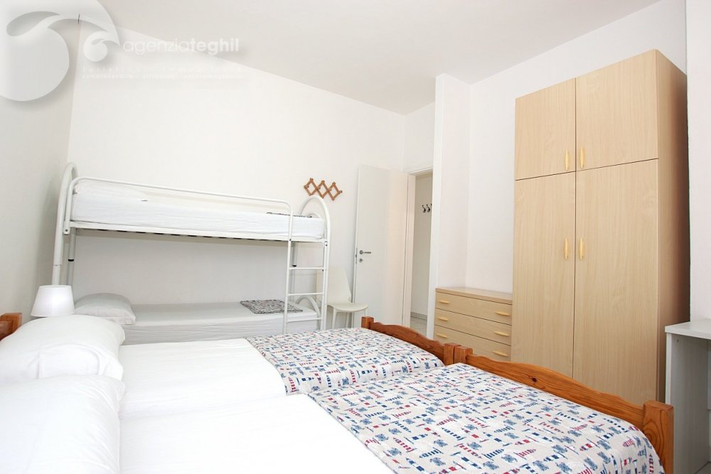 Typ B/1: 4/5 Personen. Eckwohnung im 2. Stock (ohne Lift) kürzlich renoviert. Zusammengesetzt aus ein geräumigem Schlafzimmer mit einem Doppelbett und 1 Stockbett, Wohnzimmer mit Einzelbettcouch und Kochnische mit Küchenzeile mit Kühlschrank 240 lt (separater Gefrierfach), renoviertem Bad mit Duschkabine und Fenster, ausgestattet mit Elektroboiler 50 l; kleinem Balkonanteil.