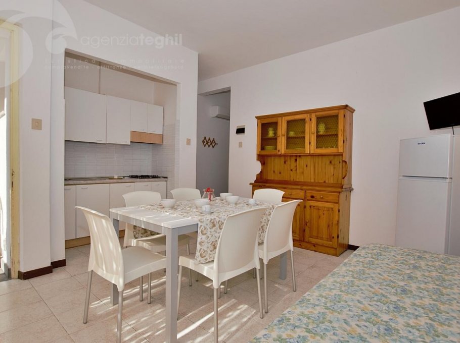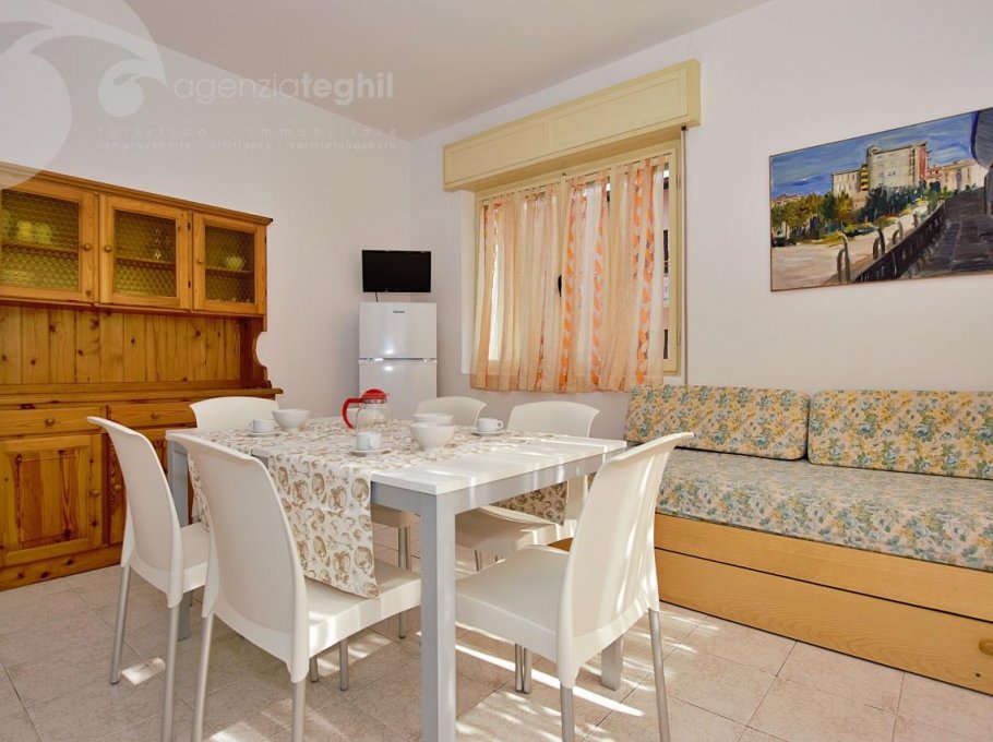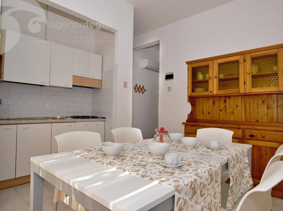 Typ B/1: 4/5 Personen. Eckwohnung im Erdgeschoss mit ein geräumigem Schlafzimmer mit einem Doppelbett und 1 Stockbett, Wohnzimmer mit Einzelbettcouch und Kochnische mit Küchenzeile mit Kühlschrank 240 lt (separater Gefrierfach), renoviertem Bad mit Duschkabine und Fenster, ausgestattet mit Elektroboiler 50 lt., kleinem Balkonanteil.
