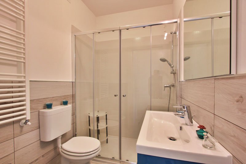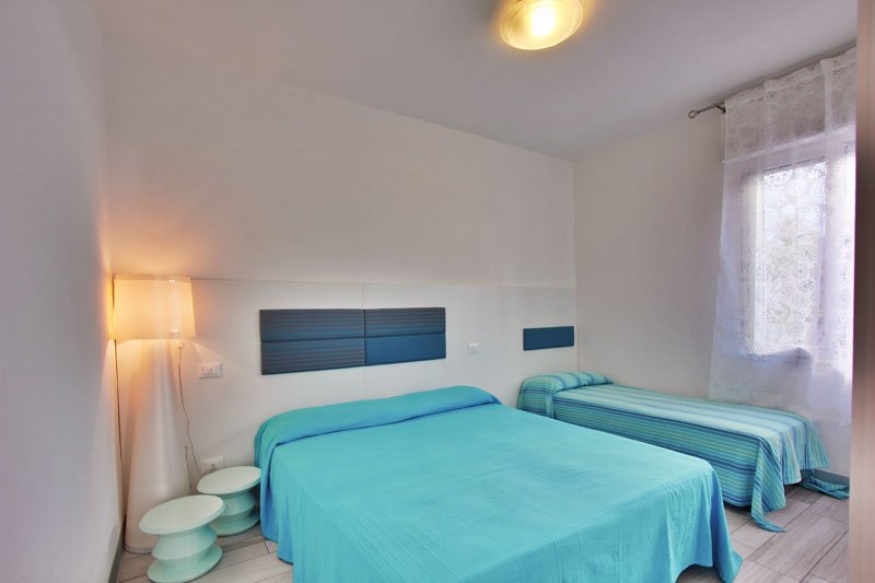 camera con letto matrimoniale e letto singolo, bagno con box doccia,