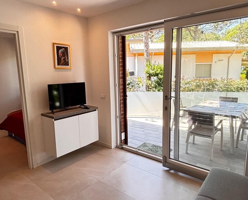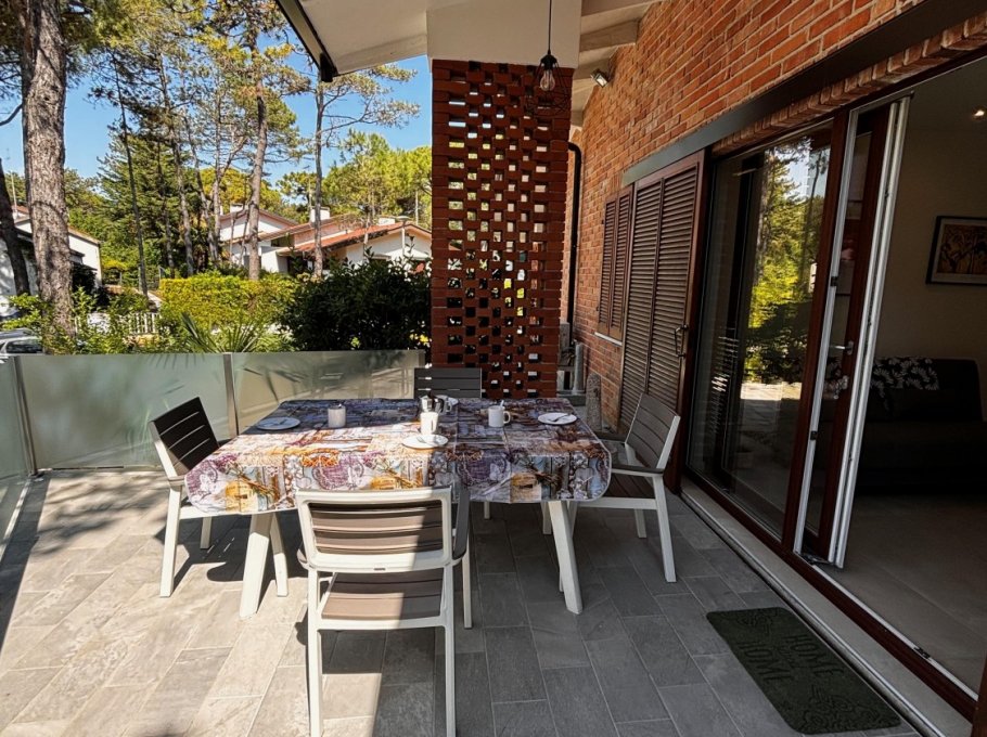 Kleine Villa, die Teil eines kleinen Dorfes mit 4 Einheiten ist, mitten im Grünen von Lignano Pineta, renoviert im Jahr 2024, bestehend aus einem Schlafzimmer mit Doppelbett, einem Schlafzimmer mit zwei Einzelbetten, Wohnzimmer, kleine Kochnische, Bad, große Terrasse, Klimaanlage, TV, Waschmaschine, Parkplatz innerhalb des Grundstücks, großer Gemeinschaftsgarten. 950 Meter vom Meer entfernt, 3 Minuten mit dem Auto.