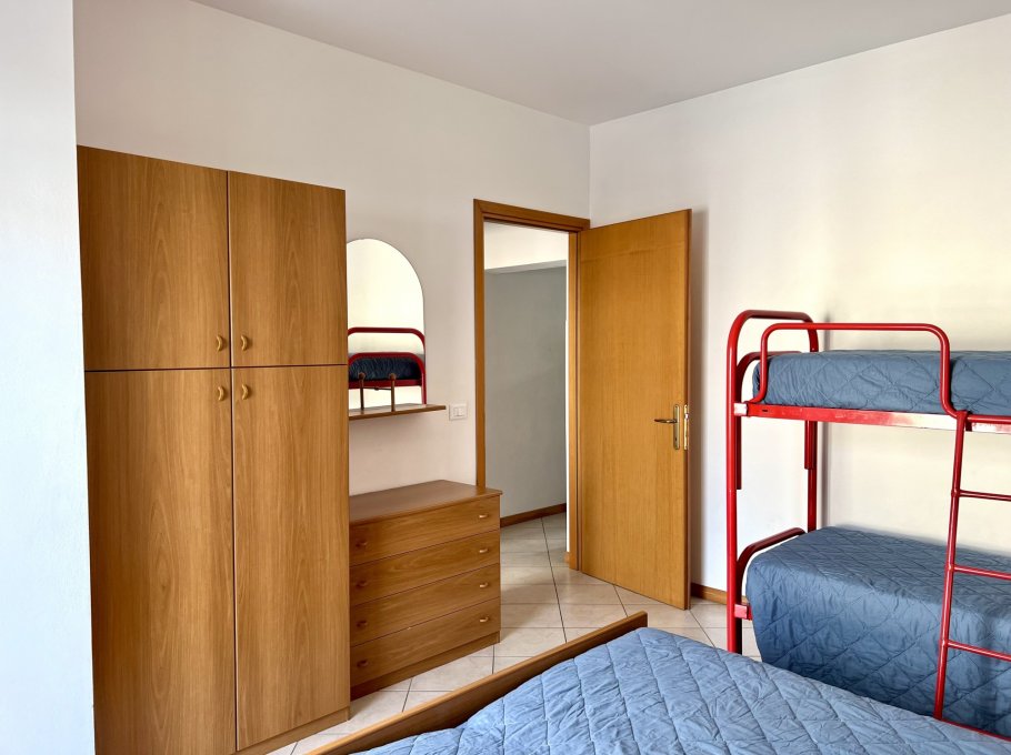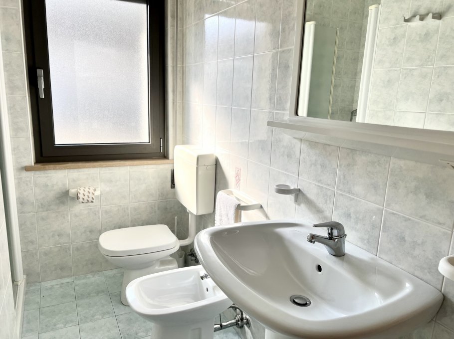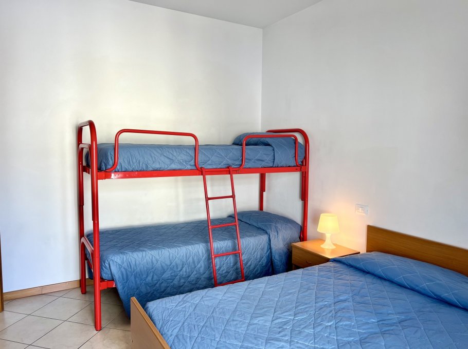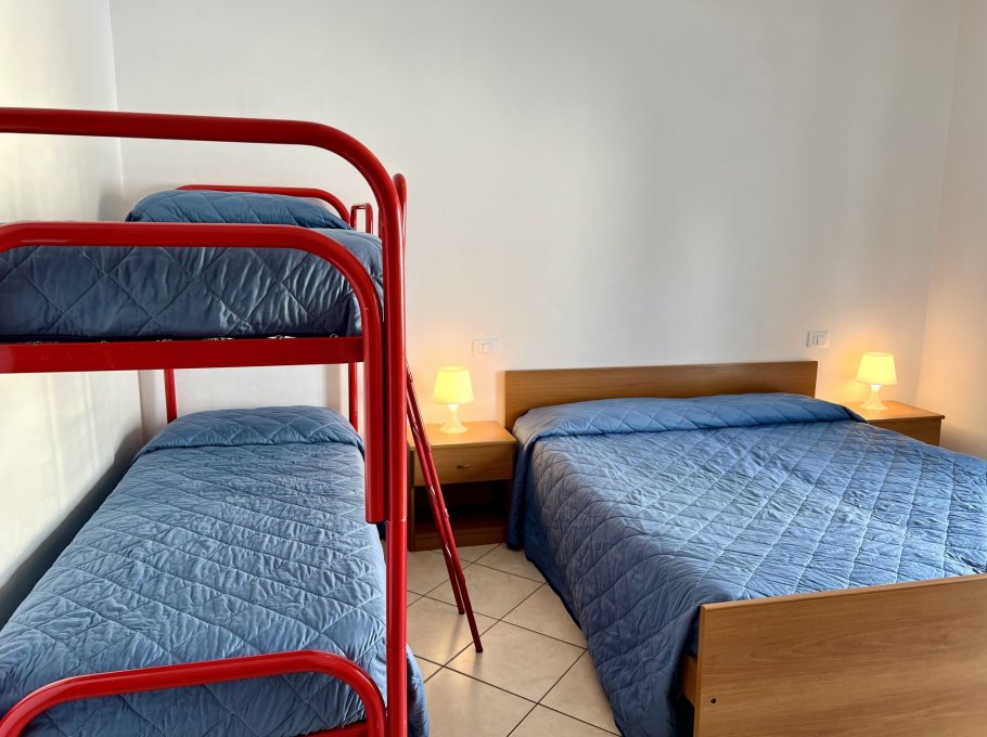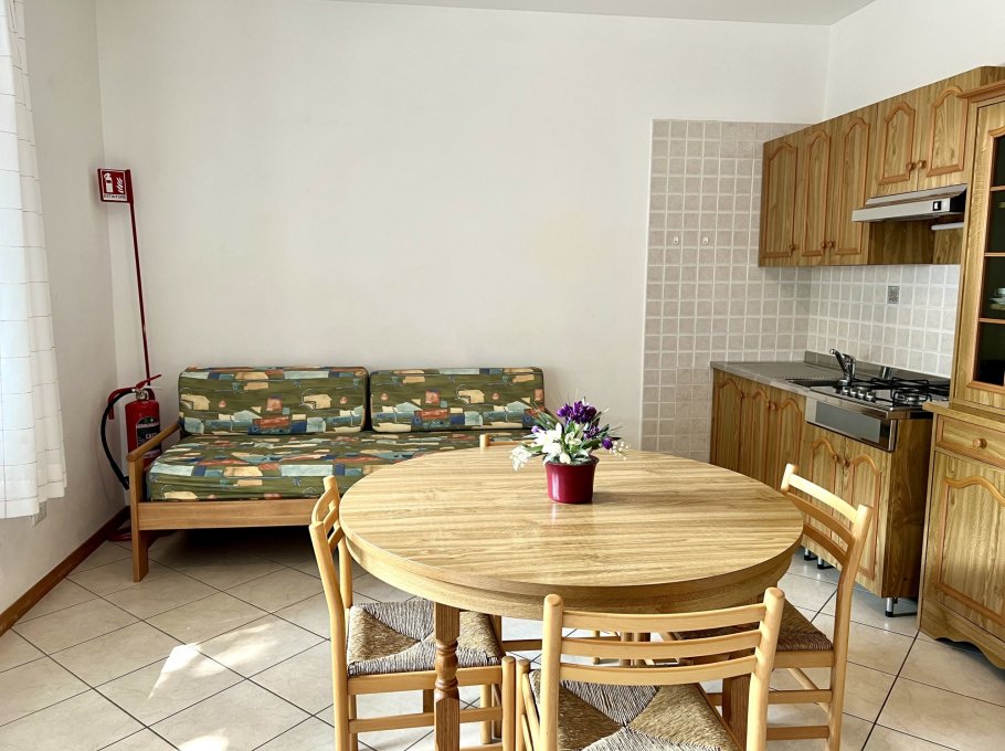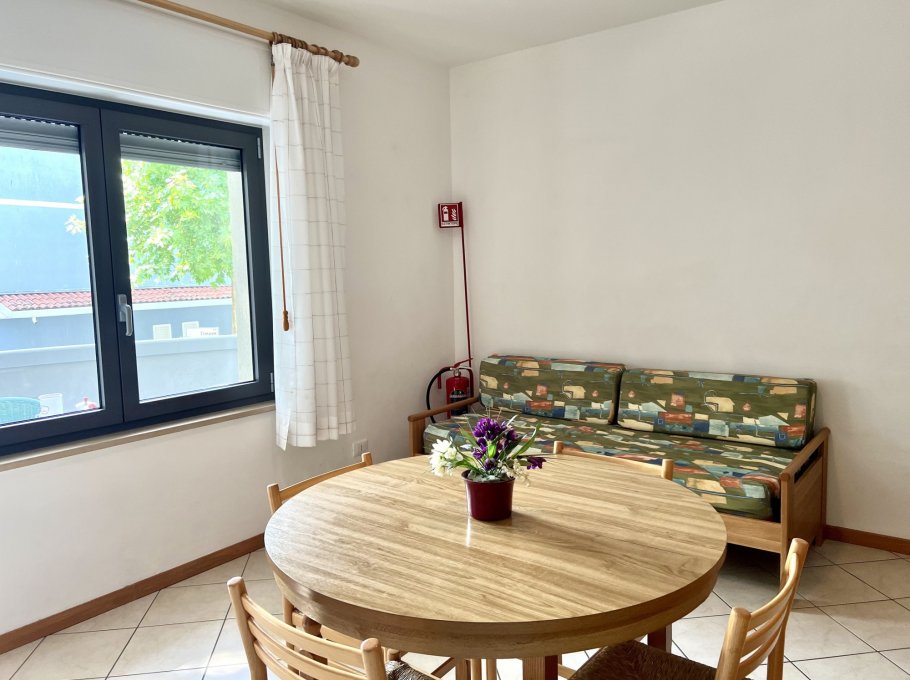 Typ B. Wohnzimmer mit Kochnische und Einzelschlafcouch, Dreibettzimmer (Doppelbett und Einzelbett), Badezimmer mit Duschkabine, kleiner Balkon und/oder ausgestatteter Aussenbereich. Entweder im Erdgeschoss oder im ersten Stock. Max 4 Pax.