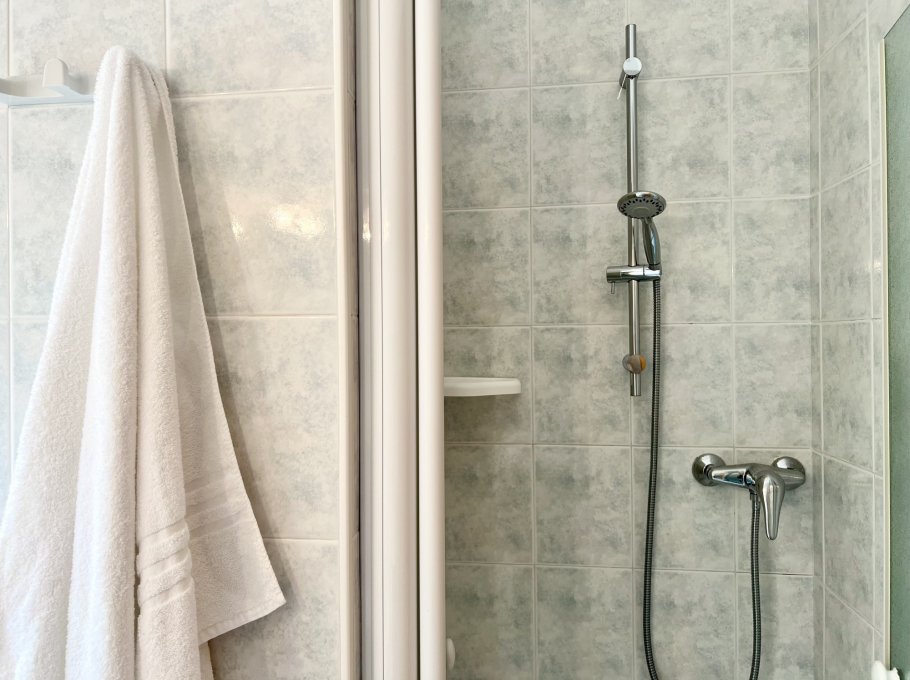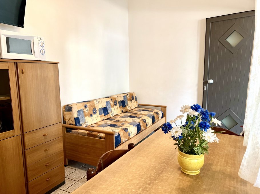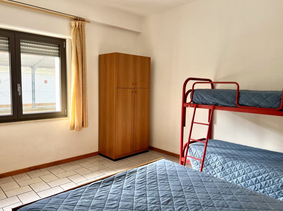 Typ B4T. Wohnzimmer mit Kochnische und Einzelschlafcouch, Dreibettzimmer (Doppelbett und Einzelbett), Badezimmer mit Duschkabine, kleiner ausgestatteter Aussenbereich. Die Wohnung liegt im Erdgeschoss. Max 4 Pax.
