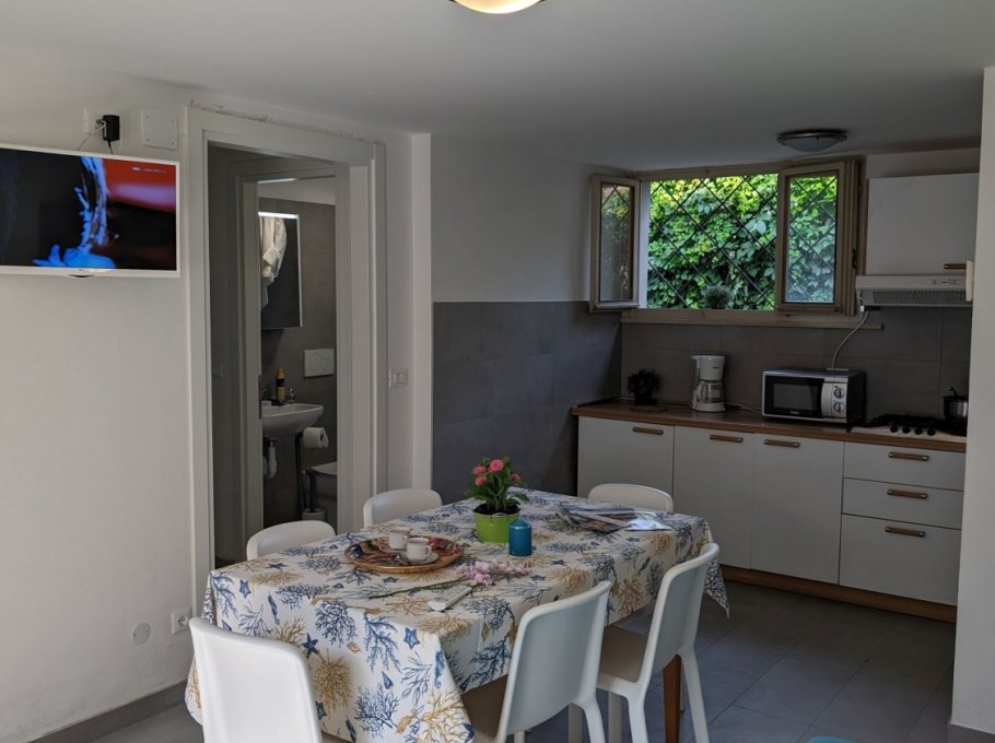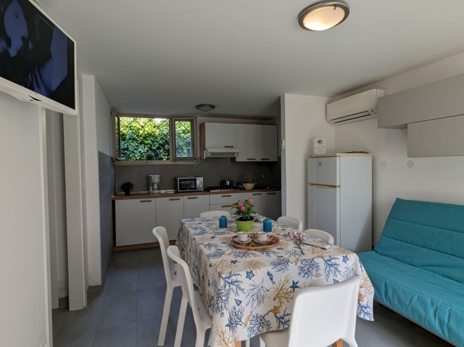 THREE-ROOM-APARTMENT for 4 persons composed of: living-room, 1 bedroom with double bed, 1 bedroom with 2 single beds, kitchen corner, bathroom. On the ground floor with common garden. Light free wi-fi (no streaming-no download).