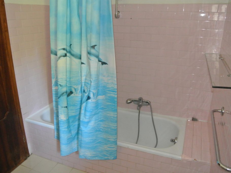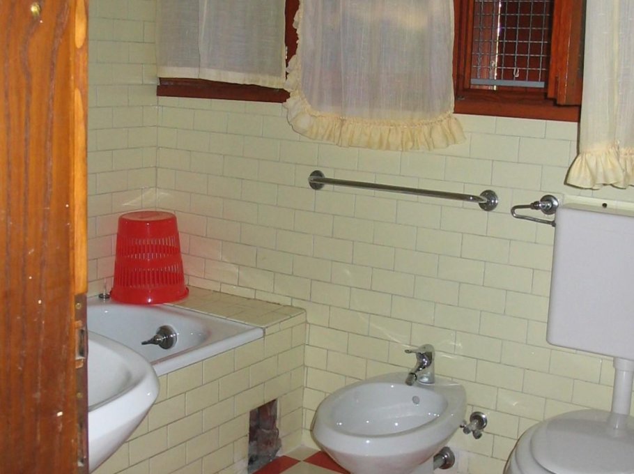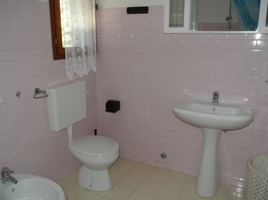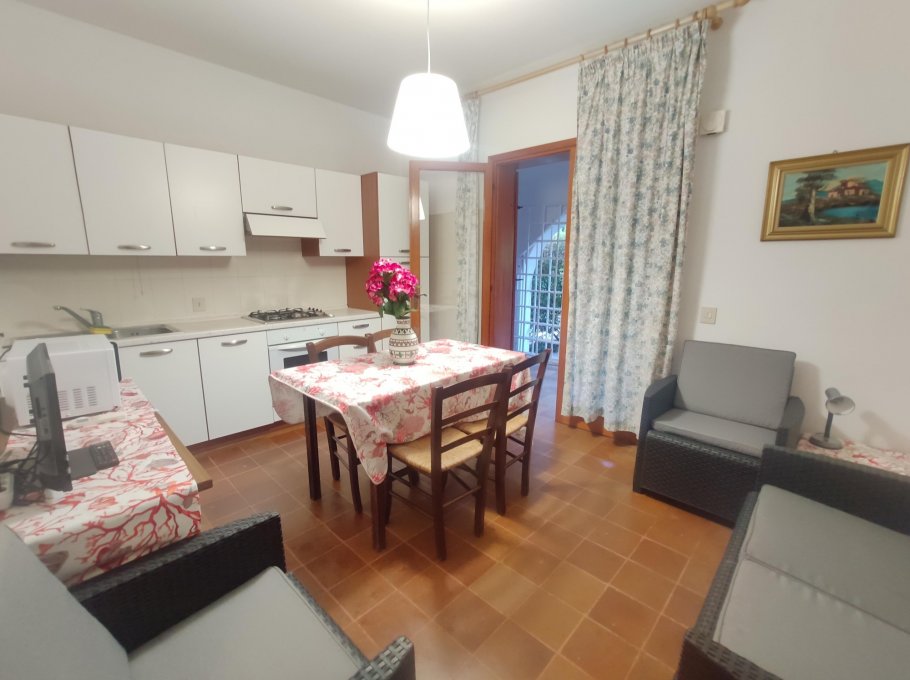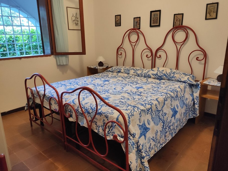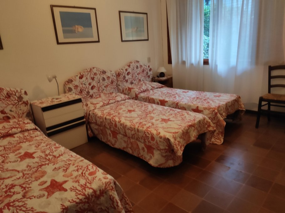 Apartment on the ground floor with small closed private garden. The apartment is made up of living-room with kitchenette, bathroom, double bed room with private bathroom, bed room with three single beds. Air condition ( extra )