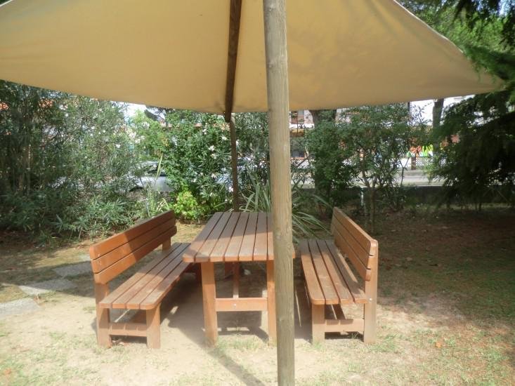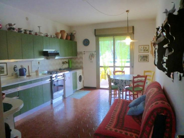 House located in Sabbiadoro ca. 700mt from the beach in quite area well served from supermarket.First floor without elevator, composed of a double bedded room, second room with twin beds, living room with kitchen, double bed sofa,bathroom shower, big terrace, Tv,parking, washmachine,common garden.