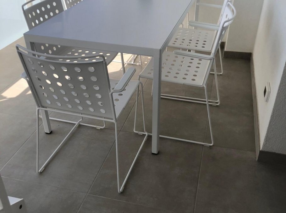 New three-room apartment with modern furnishings on the 6th floor with lift, consisting of 1 double bedroom, 1 bedroom with 2 beds, living room with sofa bed for 2 people, kitchen with dishwasher, microwave, fridge with freezer, induction hob, 2 bathrooms with shower / WC / bidet, 2 large and habitable balconies, washing machine, TV, safe, air conditioning, WiFi, numbered parking space, solarium terrace for exclusive use on the top floor of the building.