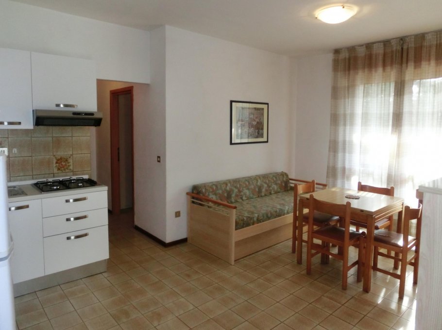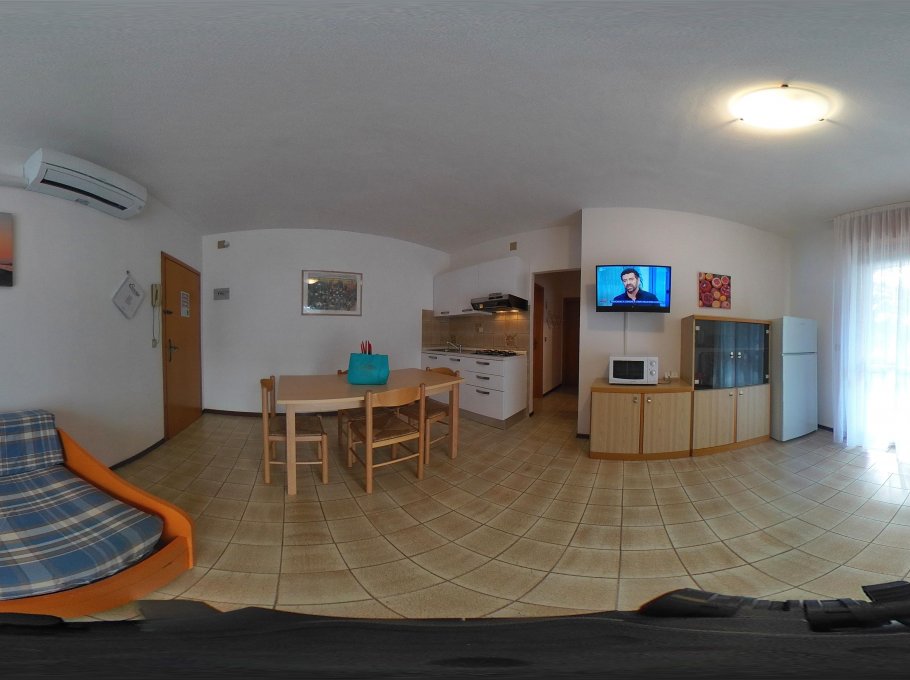 Wide apartment made up of living room with double sofa bed, cooking area, tv and microwave, double bedded room, twin bedded room, bathroom with shower box/bidet/wc and wide balcony with table and chairs. Air conditioning and final cleaning are included in the price. In the rental rules of the agency are mentioned all the above written service’s ways.