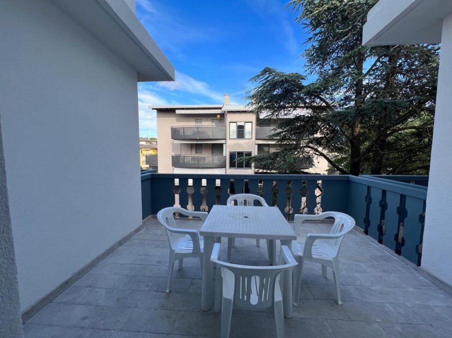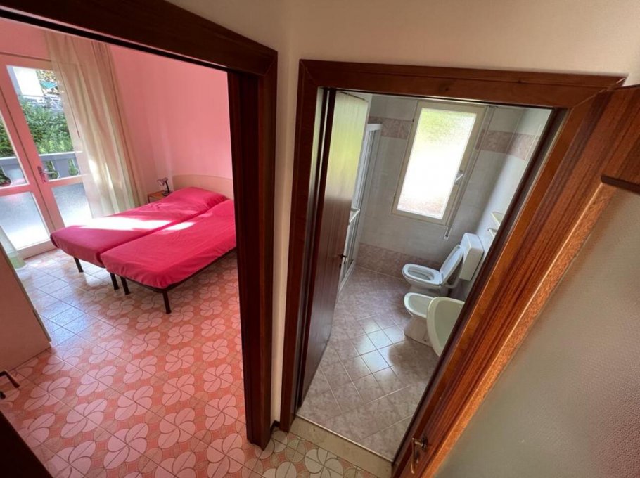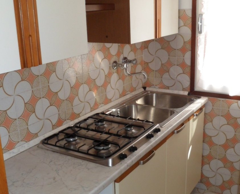 Apartment in quiet area, 300 mt. from the sea with private garden and parking. Well furnished apartment with spacious living room with kitchenette and double sofa bed, double bedroom, twin bedroom and bathroom with shower. Terrace with table and chairs. Washing machine and microwave.