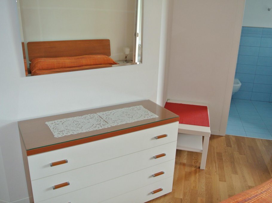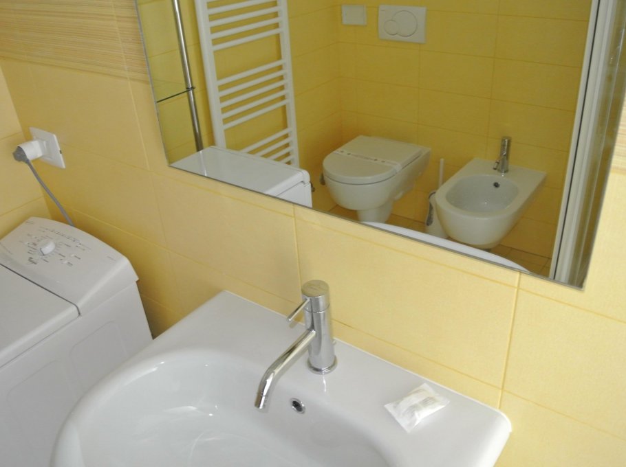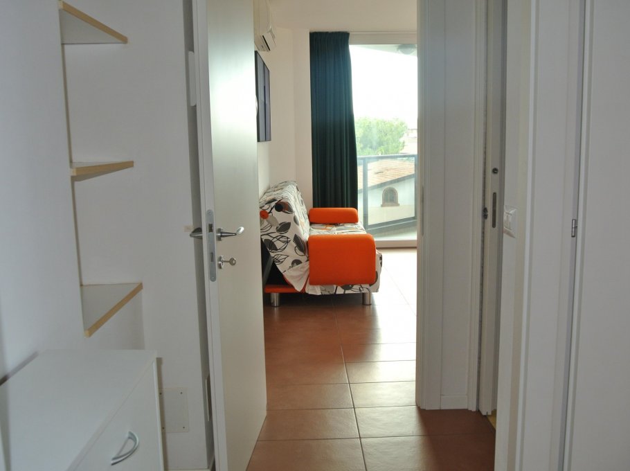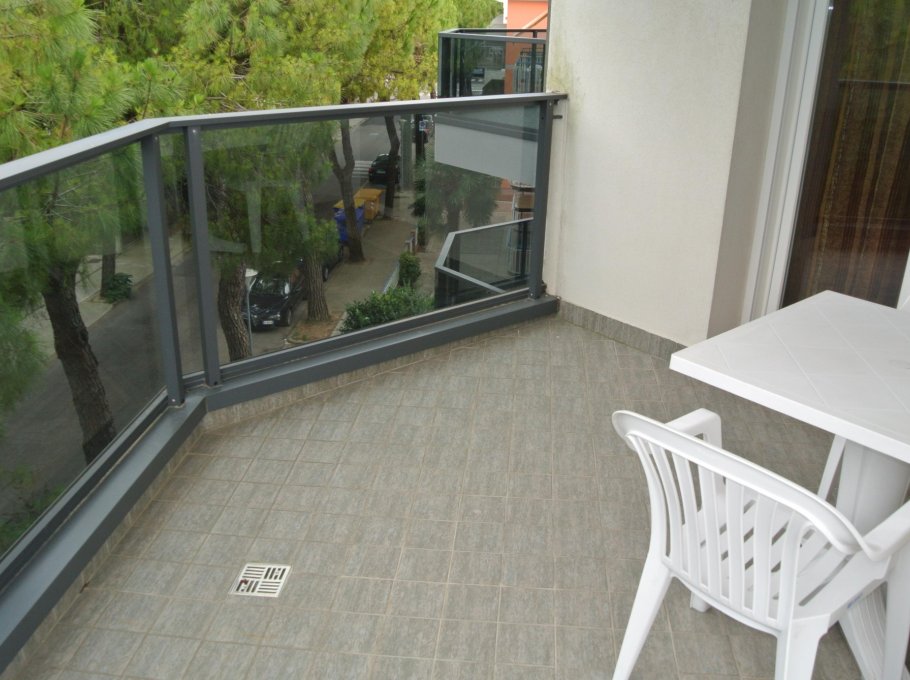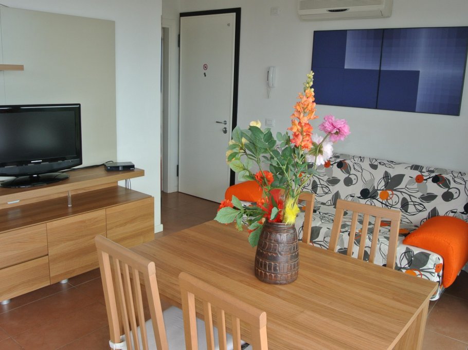 The apartment is at second floor and consists of living room with sofa bed and separate kitchenette, large terrace with table and chairs, a windowed bathroom with shower, twin bedroom, double bedroom with private bath and balcony. Door, washing machine and dishwasher, microwave oven, satellite TV, safe, air conditioning. Lift.