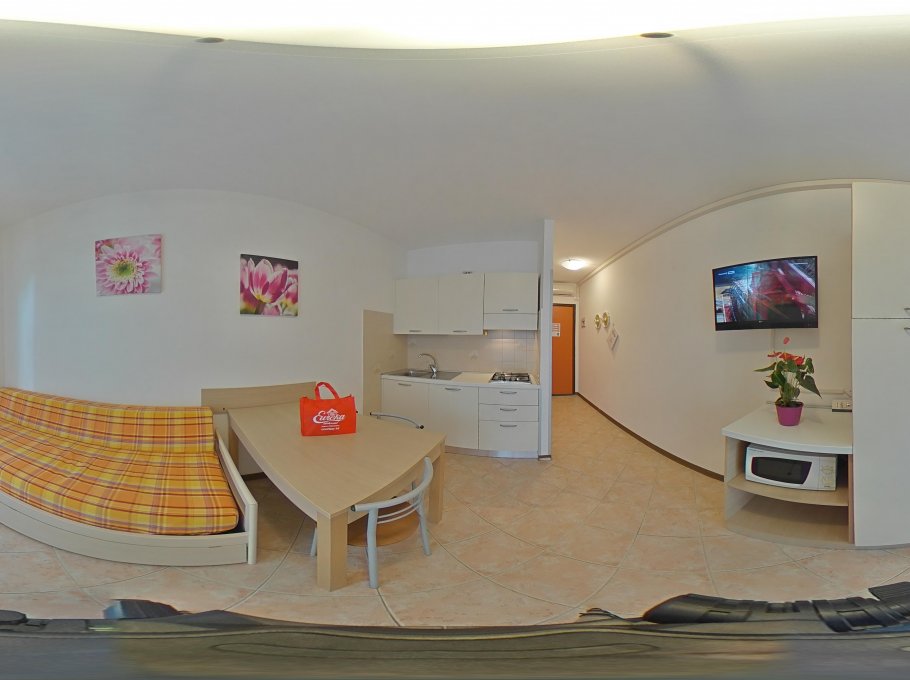 Studio apartment consisting of cooking area and double sofa-bed and a single folding bed, tv and microwave, shower box/bidet/wc and spacious furnished balcony. Air conditioning and final cleaning are included in the price. In the rental rules of the agency are mentioned all the above written service’s ways.