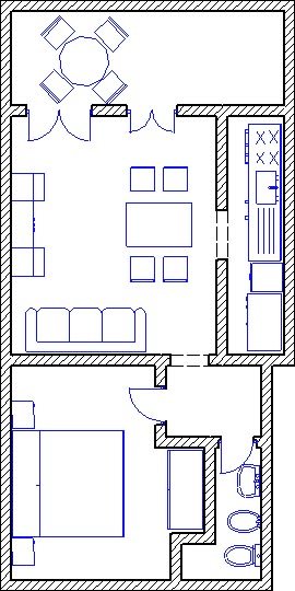 Flat composed by one bedroom with 3 beds, living room with sofa bed, TV, bathroom with shower, garden and parking area.