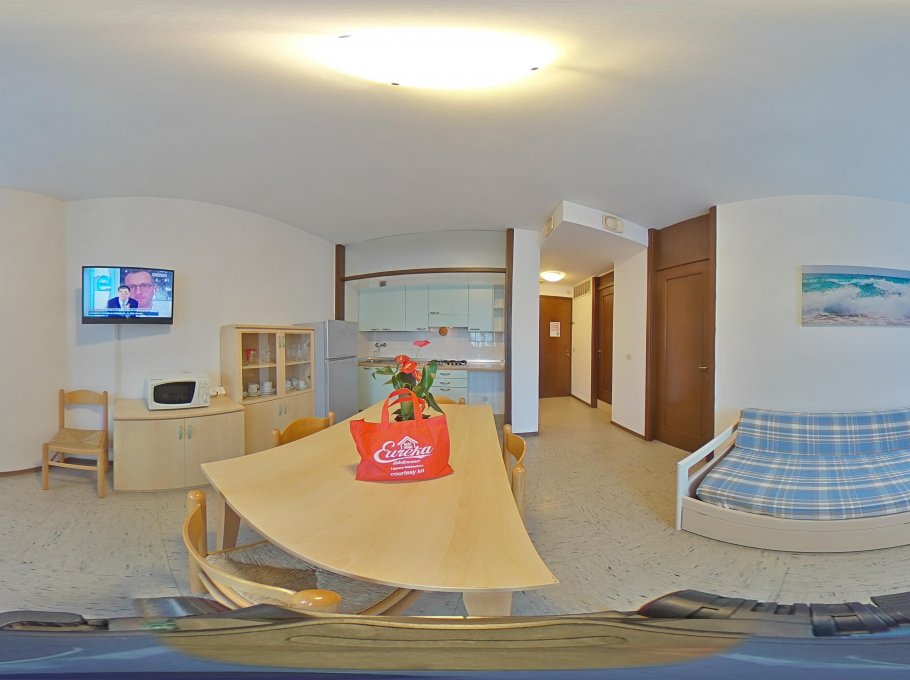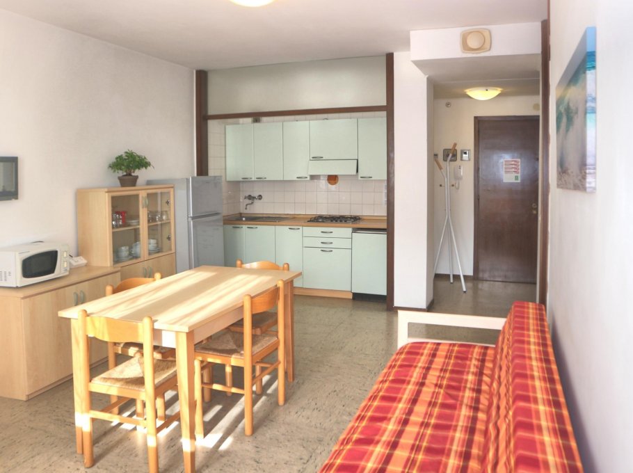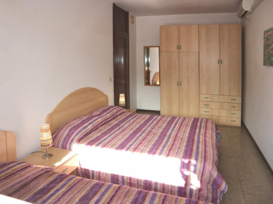 These one bedroom apartments consist of living/dining room with double sofa-bed and kitchenette, tv and microwave, a three bedded room (double bed and single bed), bathroom with shower box/bidet/wc and furnished balcony. Parking space at the "Junior parking lot" within walking distance from the residence. Air conditioning and final cleaning are included in the price. In the rental rules of the agency are mentioned all the above written service’s ways.