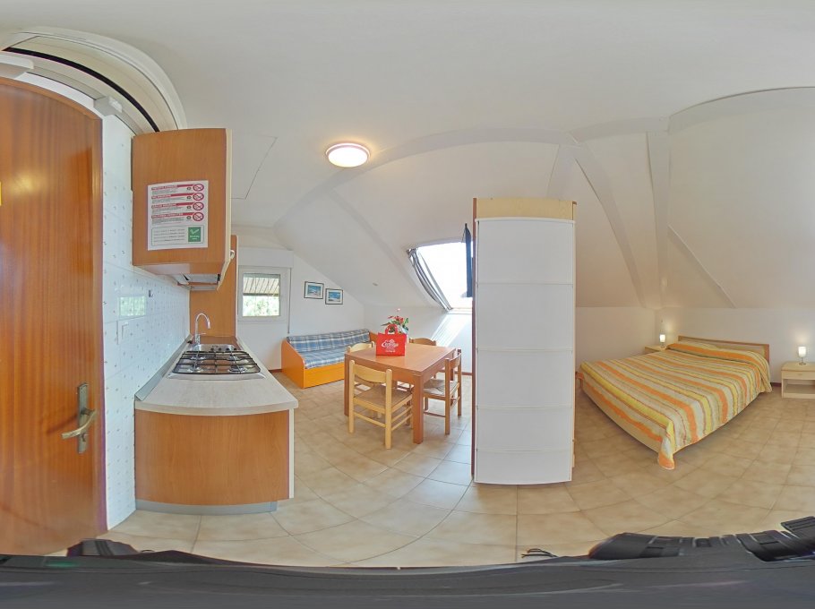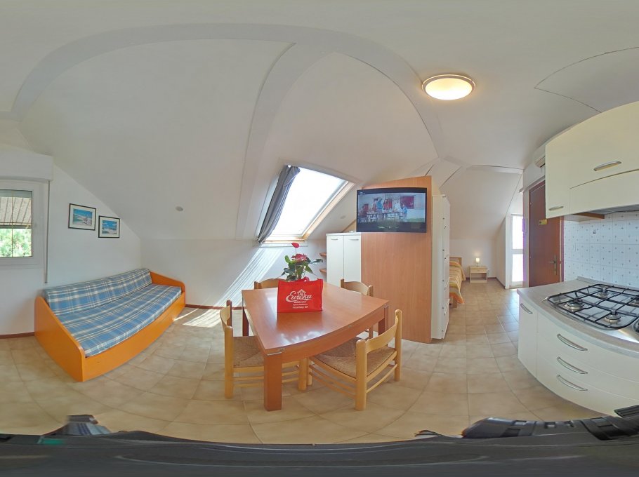 Studio apartments consisting of cooking area and single sofa-bed, tv and microwave, seperated from the sleeping area by a dividing wall consinsting in a wardrobe, double bed, shower/bidet/wc and spacious furnished terrace with view, which may be used as a solarium. Air conditioning, wi-fi and final cleaning are included in the price. In the rental rules of the agency are mentioned all the above written service’s ways. Parking place size: 5,20x2,10x3,00