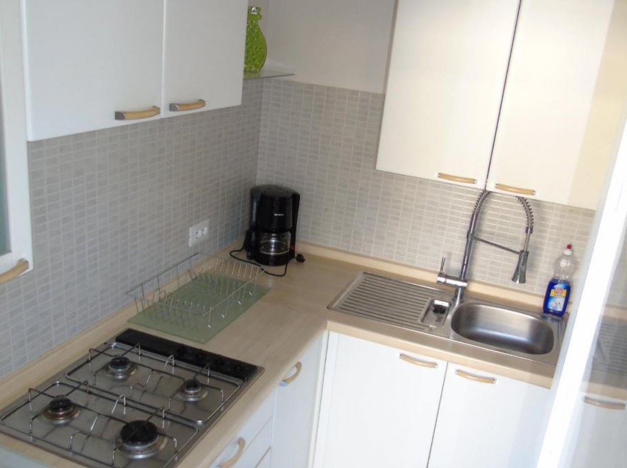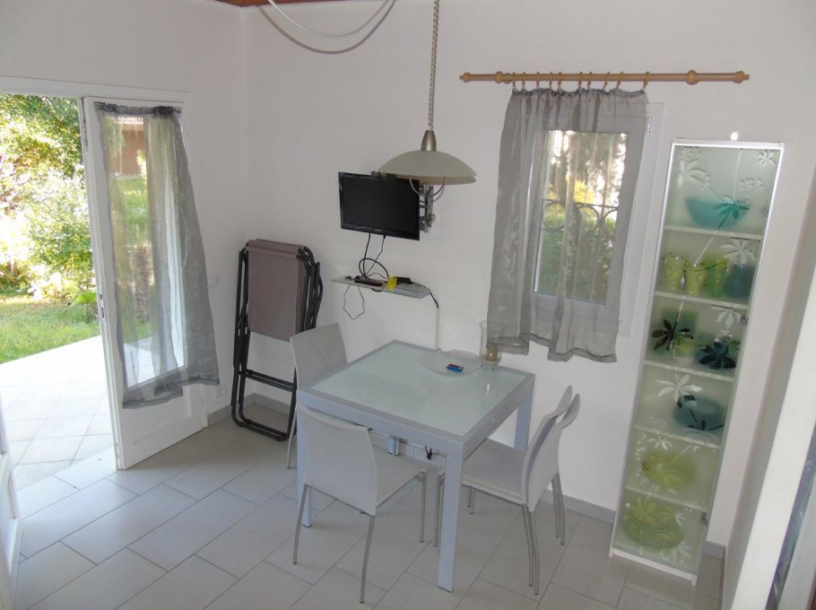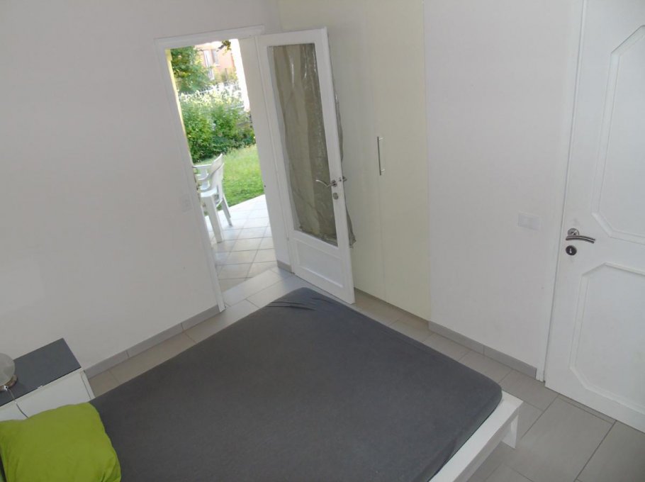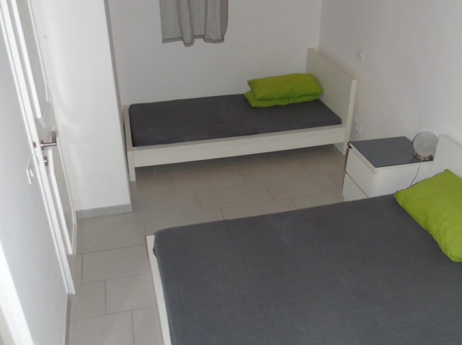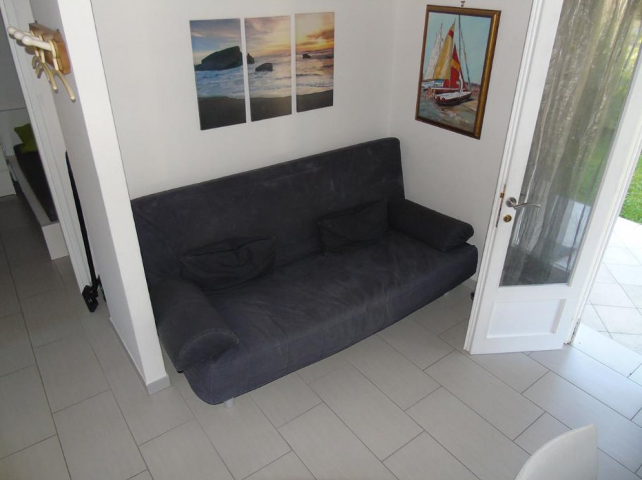 Apartment composed by: one double bedroom + single bed, livingroom with sofa bed, kitchen, bathroom with shower, washing machine, air conditioning (extra), ground floor,garden, parking place, 900m to the beach.