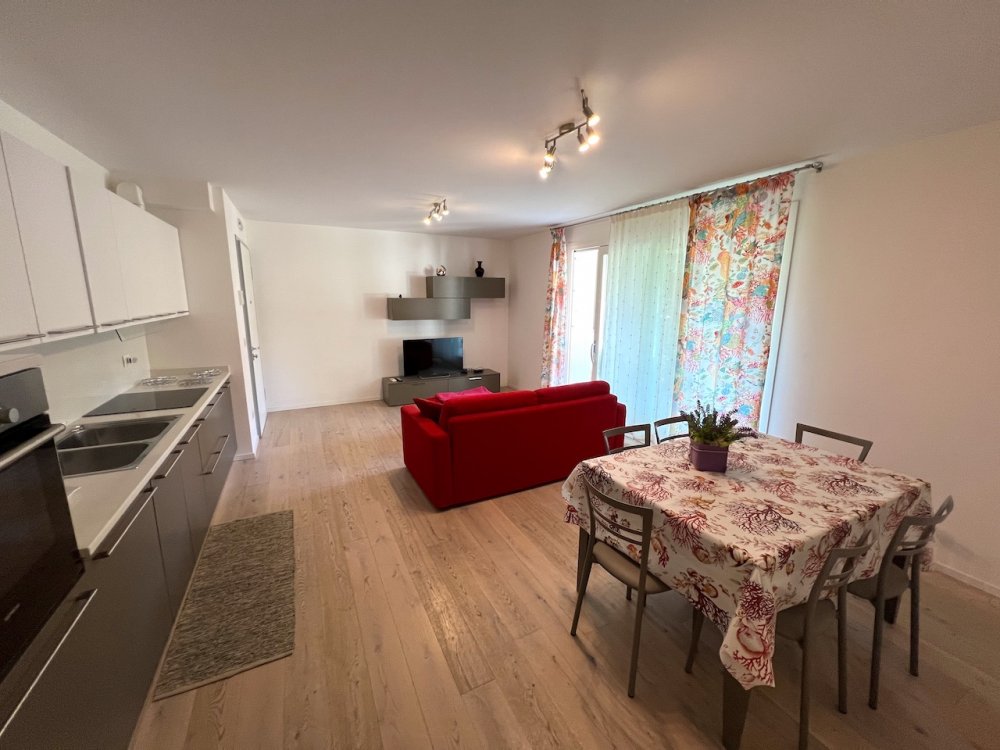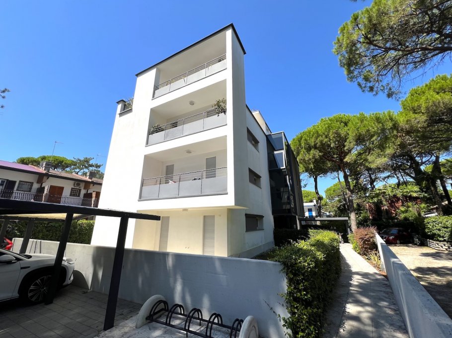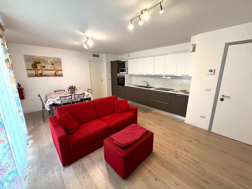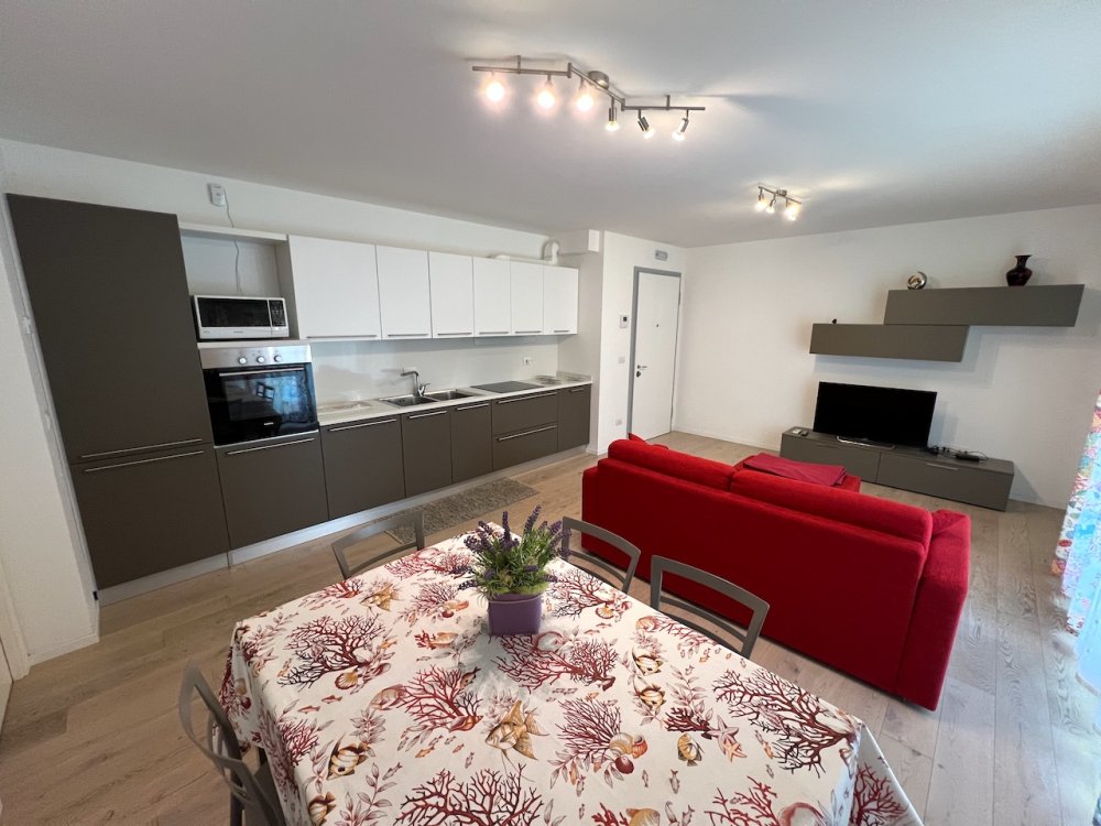 Luxury apartment in newly built apartment building, near the center of Lignano Pineta, a living room with kitchenette, double sofa bed, large terrace, 1 double bedroom, 1 bedroom with 2 beds, 1 bedroom with bunk beds, 2 bathrooms, Sat TV, air conditioning, washing machine , dishwasher, microwave, parking