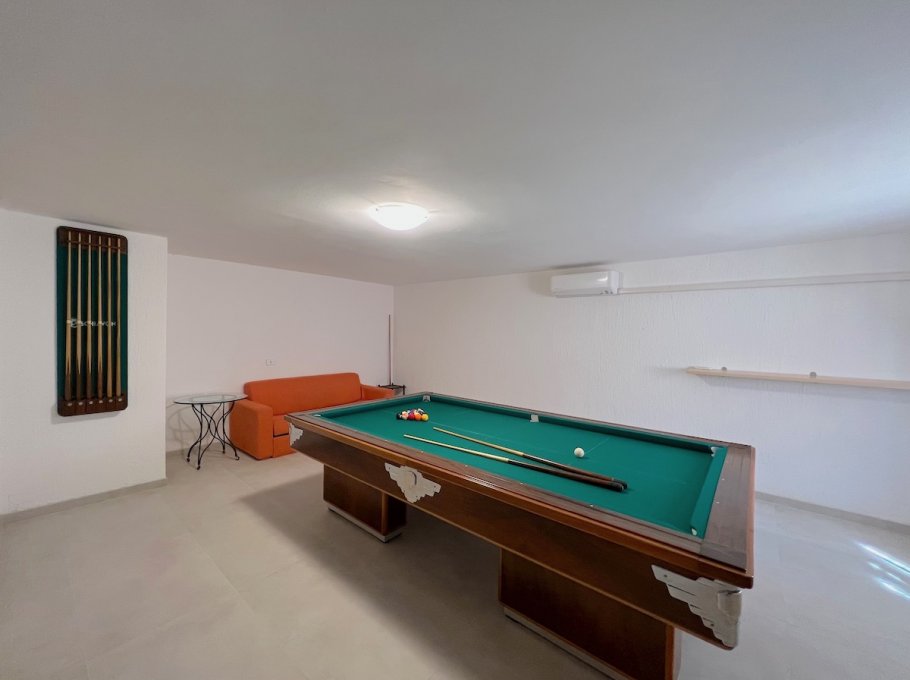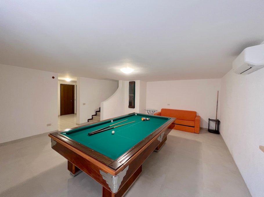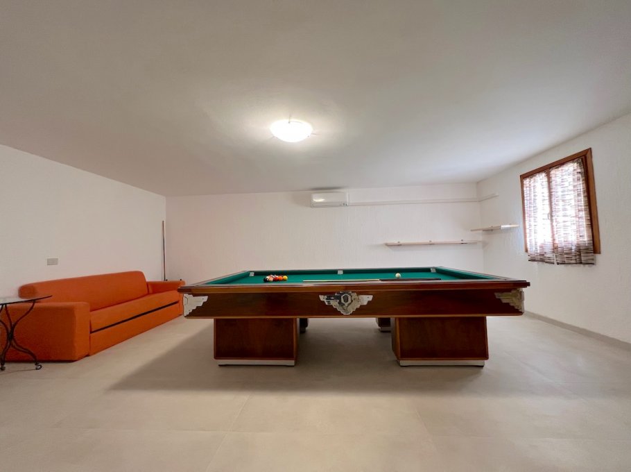 Basement: large area with 1 billiard table (for the use of the same will be required an additional deposit of euro 500,00), 1 table football and double sofa bed, 1 large double bedroom, twin bedroom, 1 large windowed bathroom with shower cubicle, laundry room. Ironing area. 3 Parking spaces. Total beds 10/12. Very large garden.