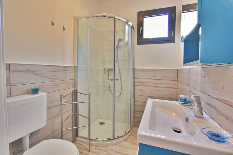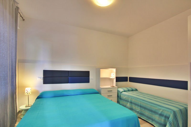 camera con letto matrimoniale e letto singolo, bagno con box doccia,
