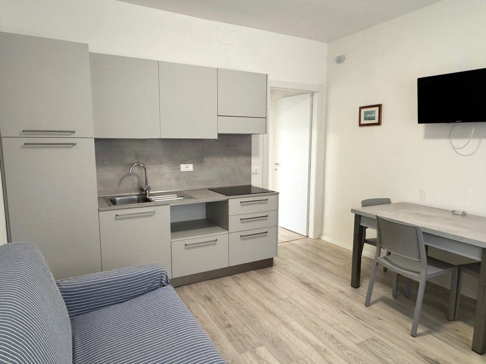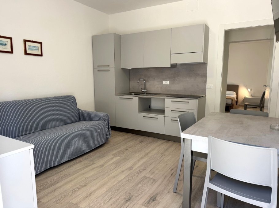 The house in front, on Via Miramare (on the road) has four apartments, two on the ground floor and two on the 1st floor and consist of a living room with kitchenette (induction), where there is a sofa bed, a bedroom with double bed + single bed, bathroom with shower; with air conditioning. The terrace of the apartments on the first floor is shared.