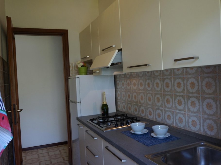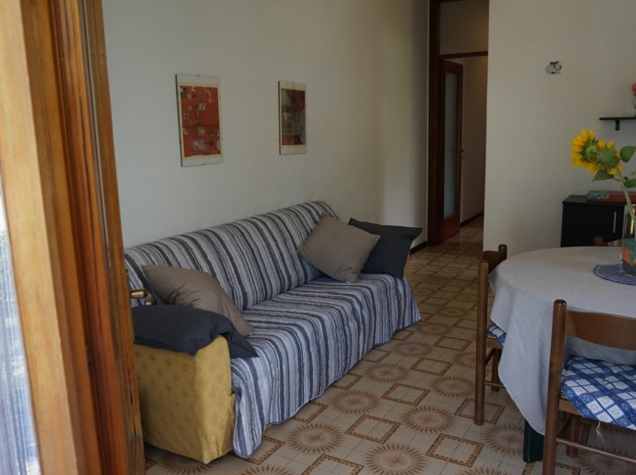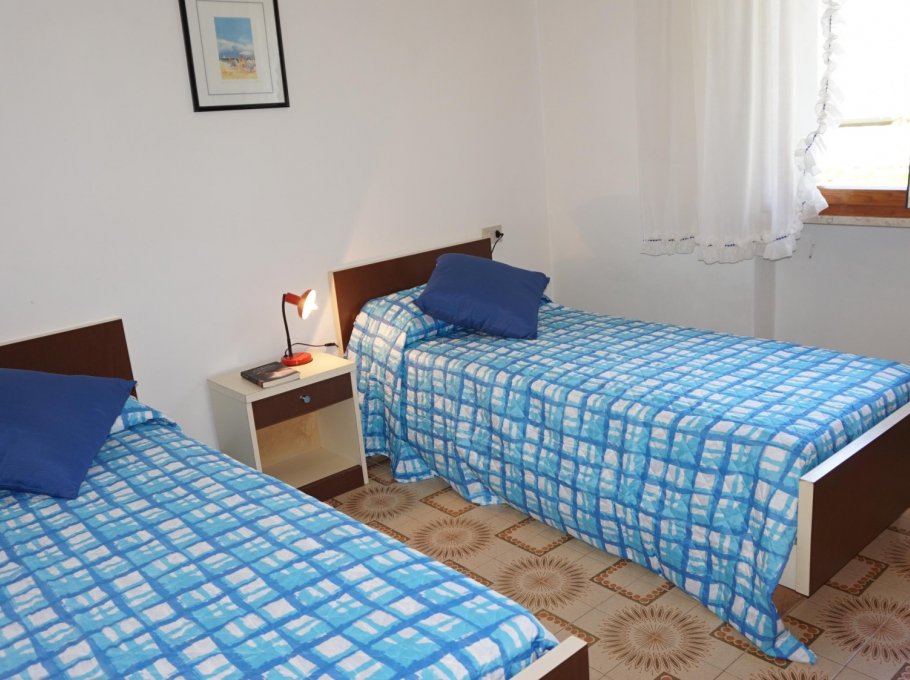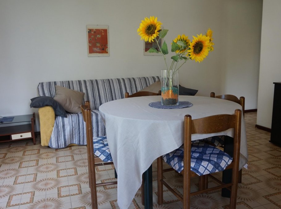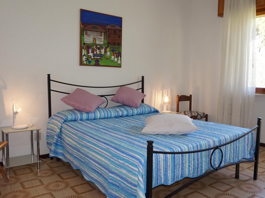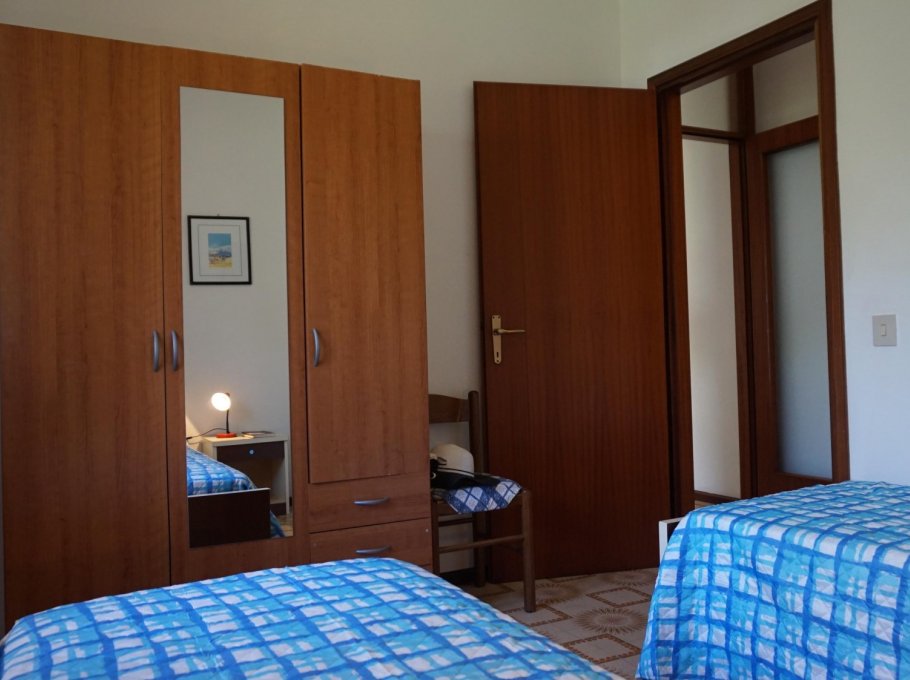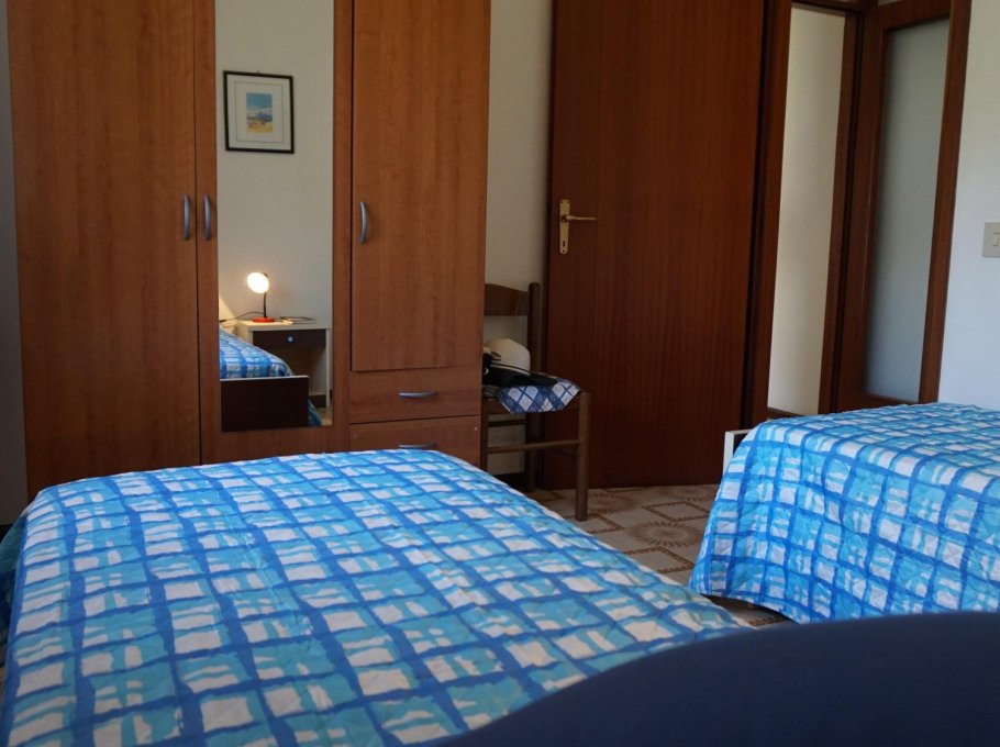 Three-room apartment on the first floor, consisting of living room with sofa bed and French window on the terrace equipped with table and chairs for six people, kitchenette, double bedroom, twin bedroom, renovated bathroom with shower and window.