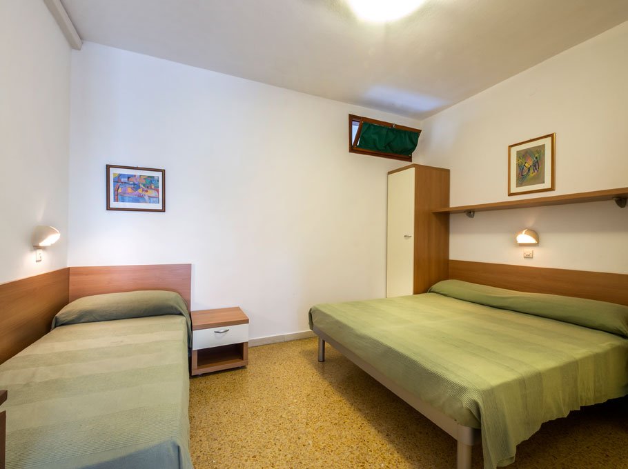 Schlafbereich mit einem Doppelbett und einem Einzelbett. In der Wohnküche gibt es noch ein Schlafsofa zum Ausziehen