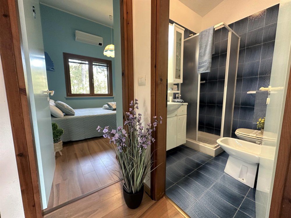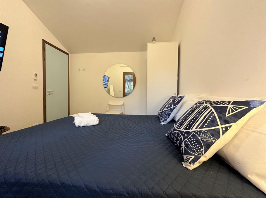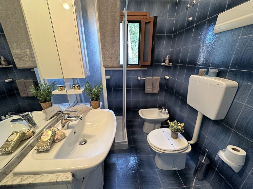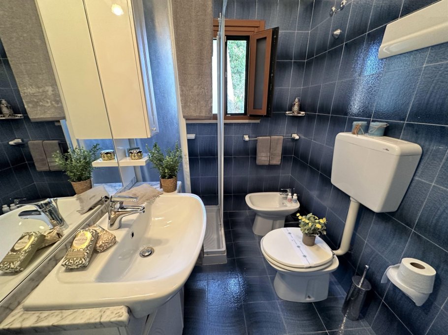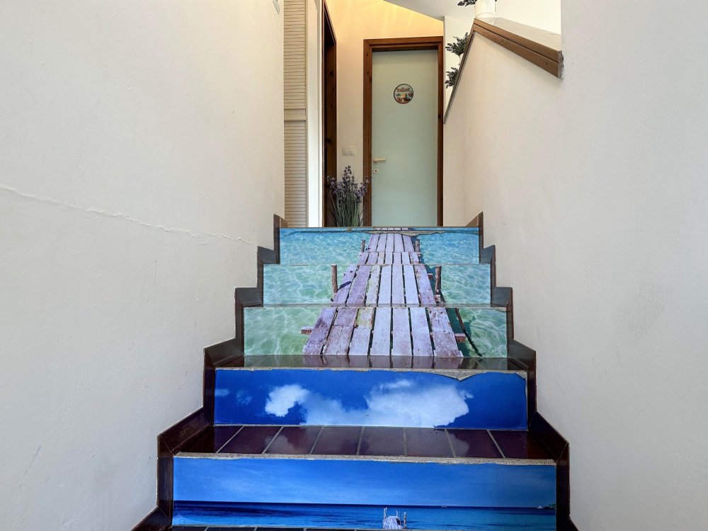On the second level, accessible via an original internal staircase, there is a double bedroom with a terrace, a second double bedroom and a small bedroom with bunk beds, also with a terrace. There are two bathrooms, one with a window, both with shower cubicles.
