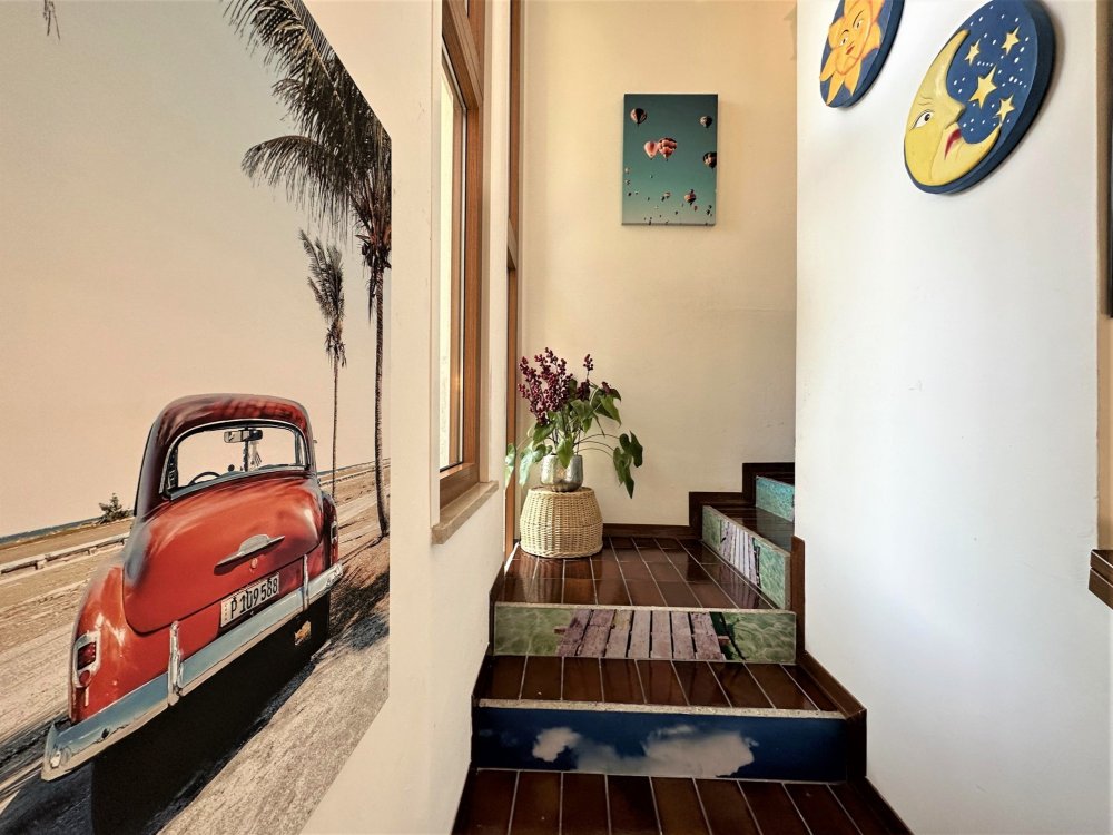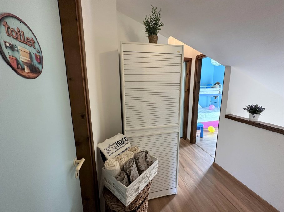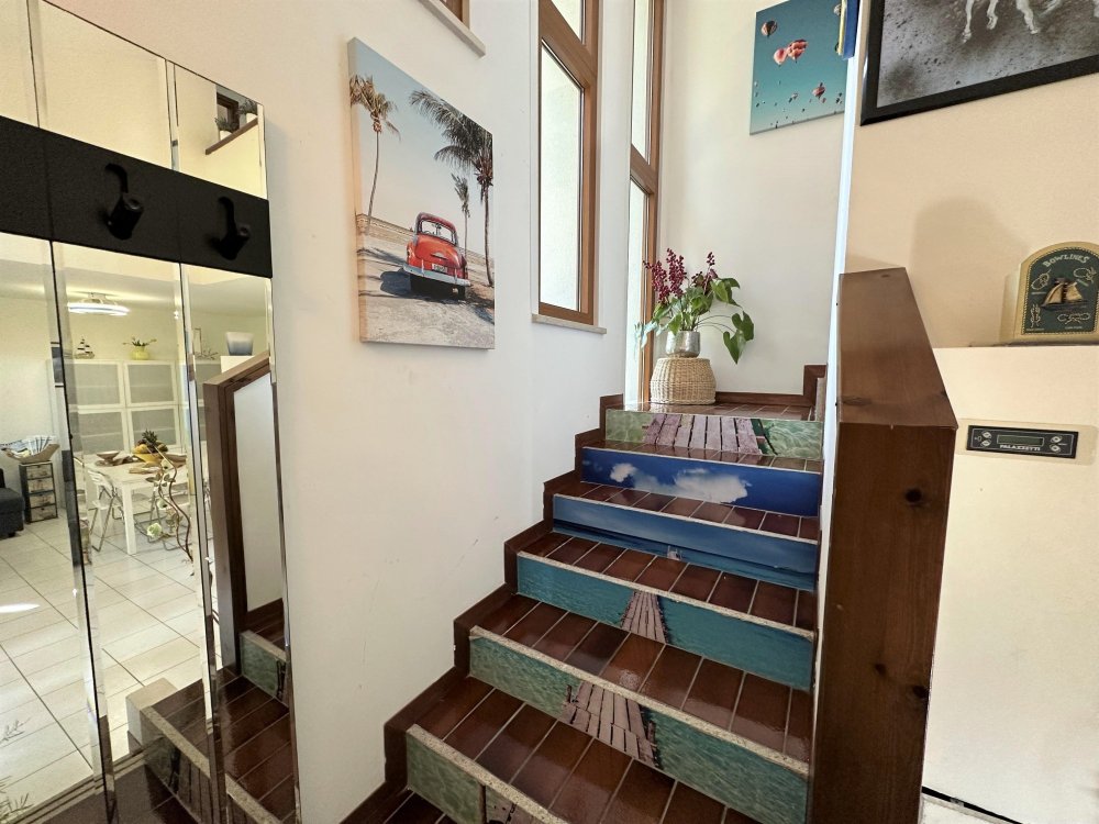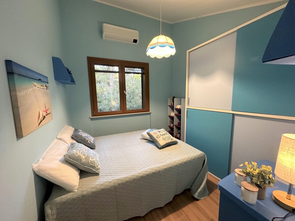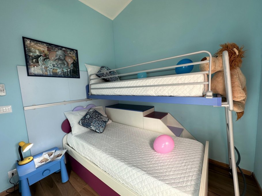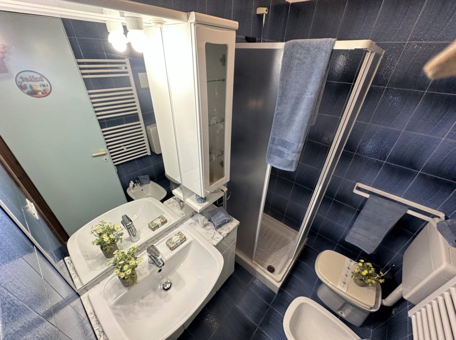 On the second level, accessible via an original internal staircase, there is a double bedroom with a terrace, a second double bedroom and a small bedroom with bunk beds, also with a terrace. There are two bathrooms, one with a window, both with shower cubicles.