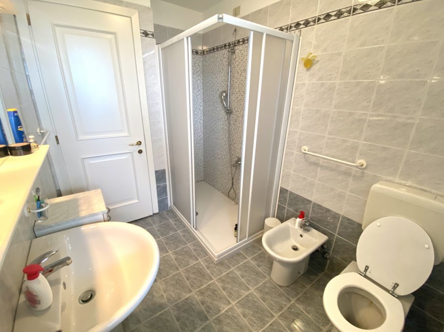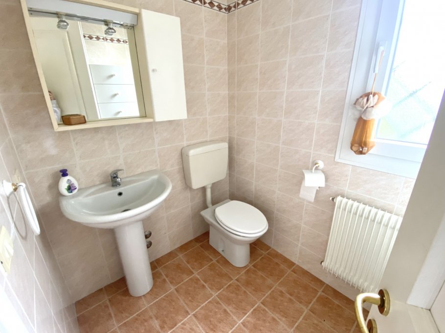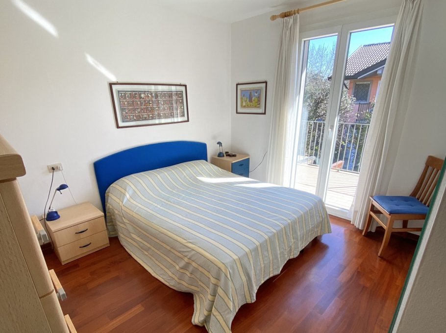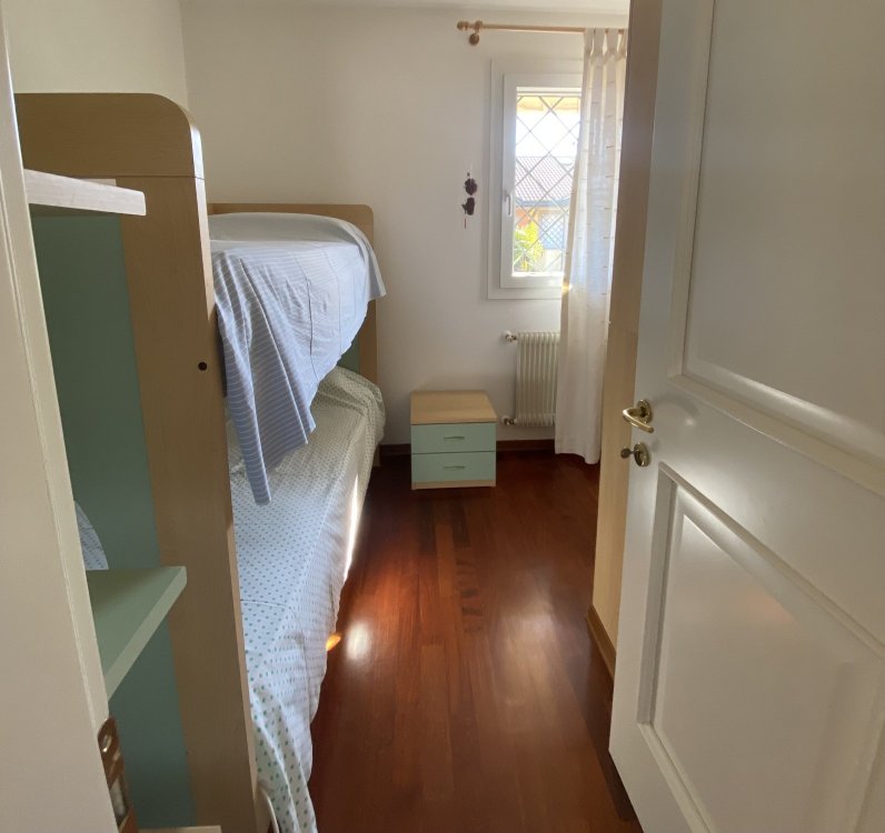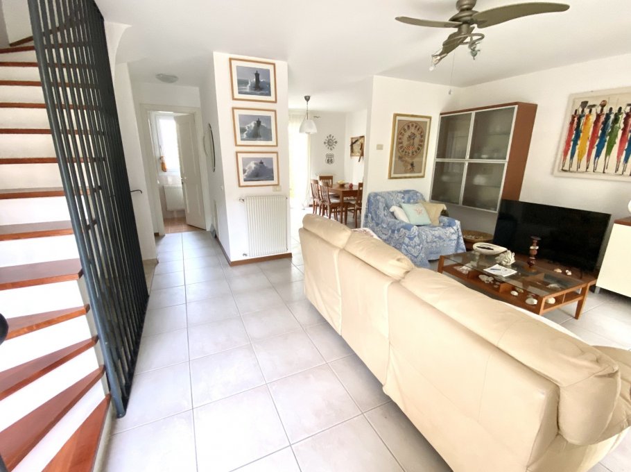 Type D: cozy, tastefully furnished terraced house with a fenced garden. The ground floor comprises a bright living room, a large kitchen with a furnished outdoor patio, and a guest bathroom. The first floor features two double bedrooms, a bedroom with bunk beds, a bathroom with shower, and two terraces. The basement level includes a bathroom with shower and a laundry room. Sleeps 6. TV, air conditioning, washing machine, dishwasher, and microwave.