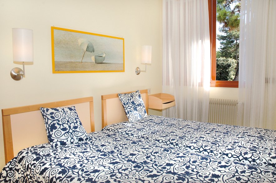 Renewed rowhouses with garden, garage, TV/SAT, washing machine, microwave, air-conditioning with fee. Type D nr. 3 - 1. floor: 1 bedroom with double bed, 1 bedroom with 2 beds, 1 bedroom with 1 bed, 1 bathroom with showerbox/WC/bidet, balcony; ground floor: living room with 2 sofas, kitchen,bathroom with showerbox/WC, equipped terrace. Beach material included. Initial and check out cleaning in each apartment are done according to COVID19 protocols. At all check out, our cleaning staff will replace every pillow covers and mattress covers with disposable, analgesic and anti-mite ones.