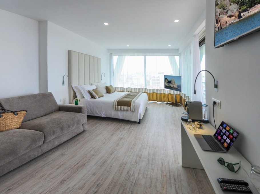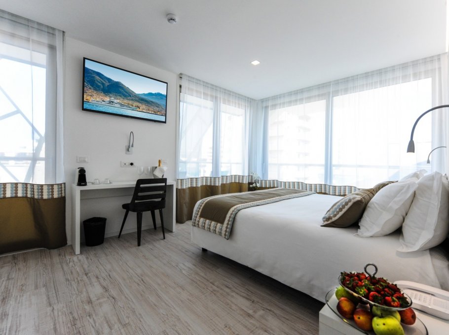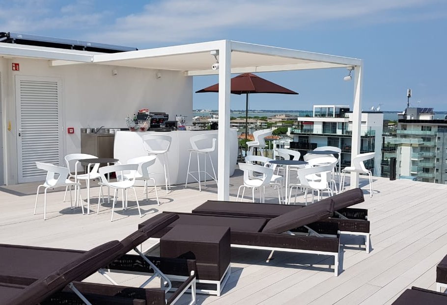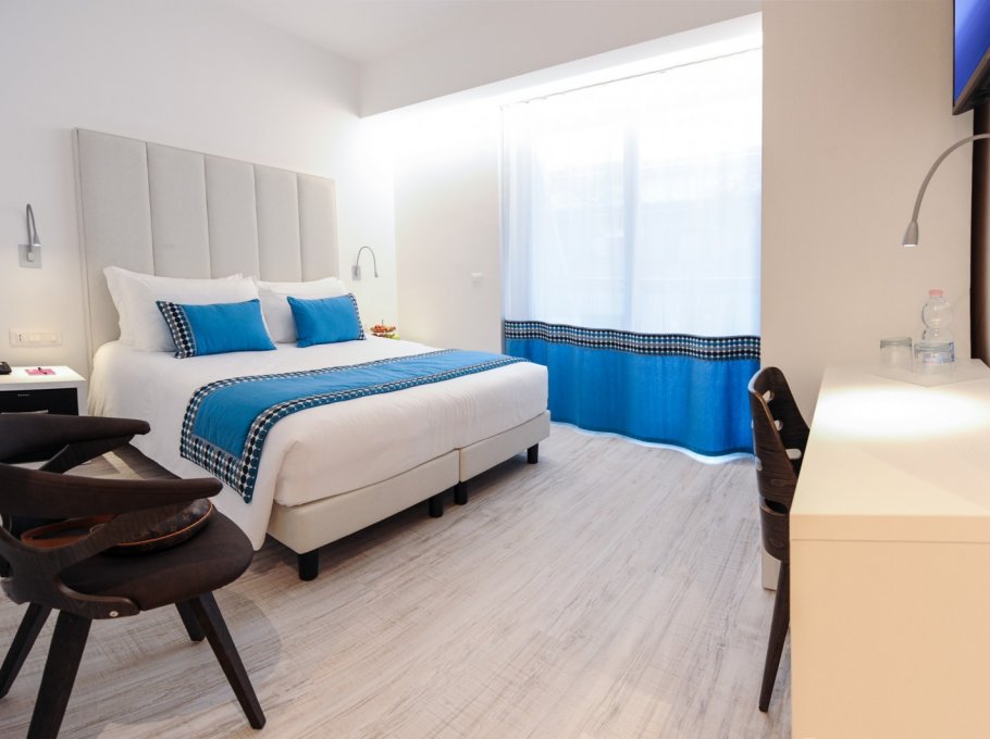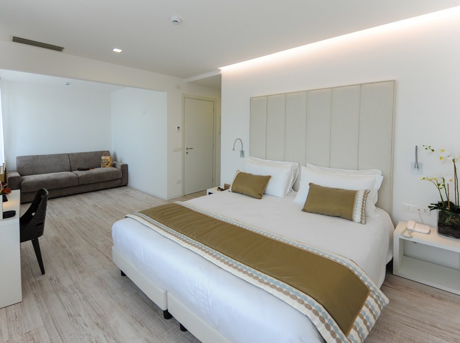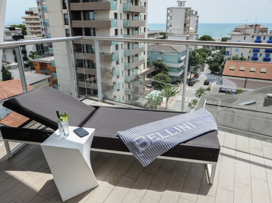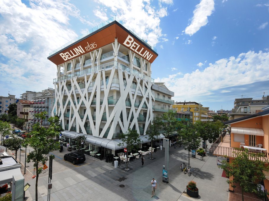 The hotel Bellini is located in Lignano Sabbiadoro and the modern minimalist light coloured design is its feature. Big and comfortable rooms offer to the guests a fresh and modern style.