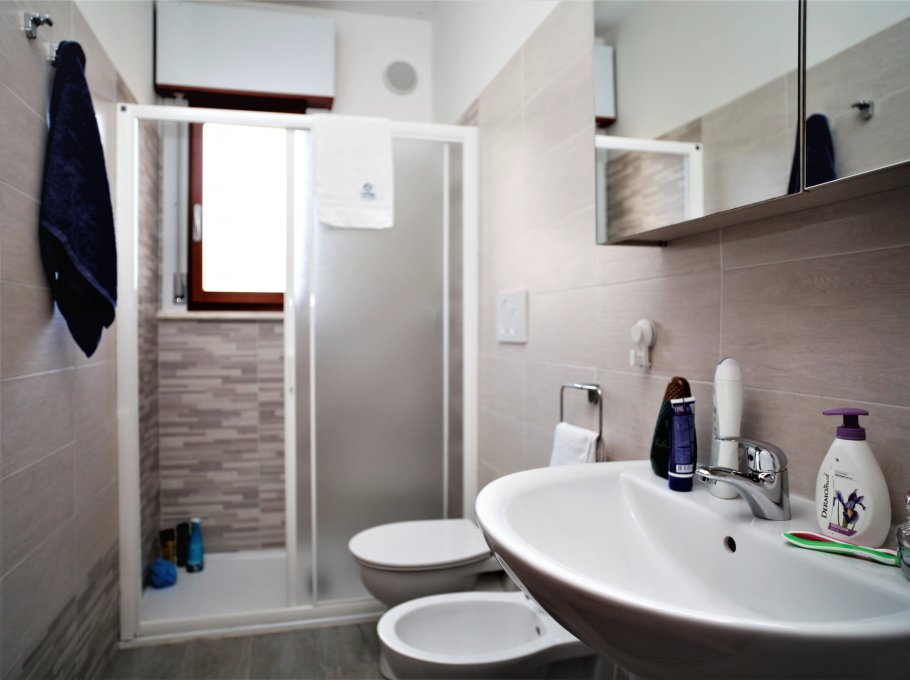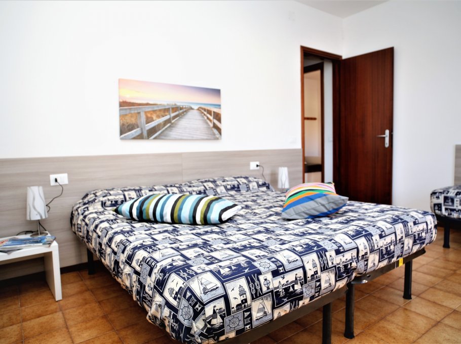 THREE-ROOM APARTMENT with 5-7 beds, composed of: living room with double sofa-bed, 1 bedroom with double bed and 1 single bed, a bedroom with two single beds, kitchen-korner, bathroom, terrace, washing machine and air conditioning.