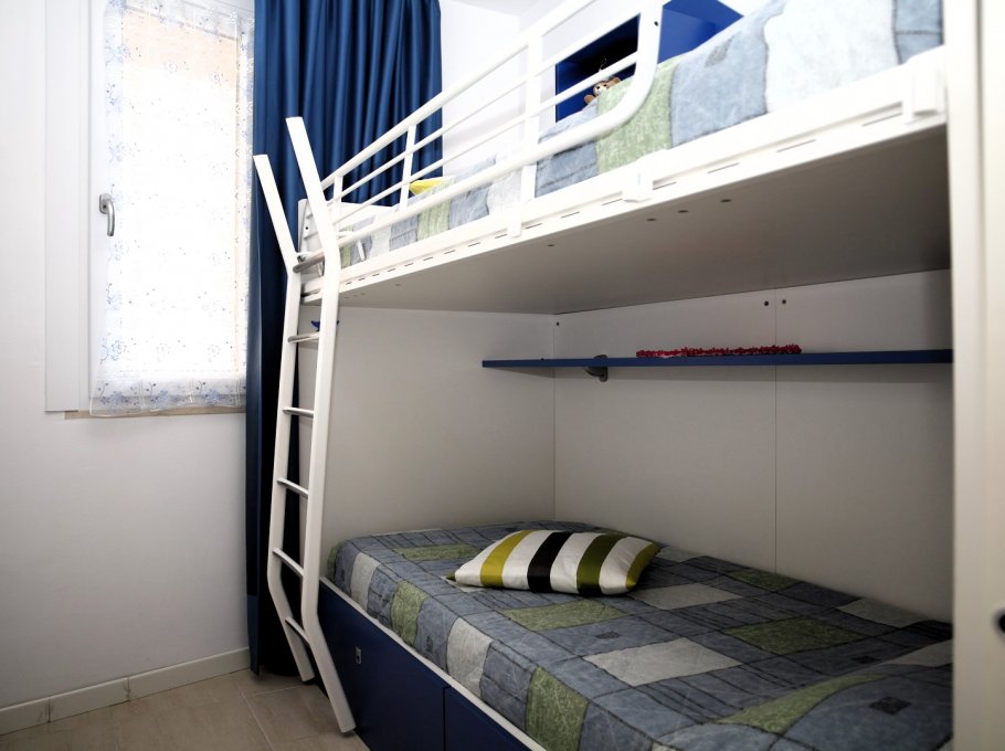 TYPE C-4: THREE-ROOM-APARTMENT for 4 persons, located on the raised ground floor, composed of: living room with kitchen corner, 1 bedroom with 1 double bed, 1 bedroom with 1 bunk bed, bathroom with window and washing machine, large terrace, reserved parking place, air conditioning.