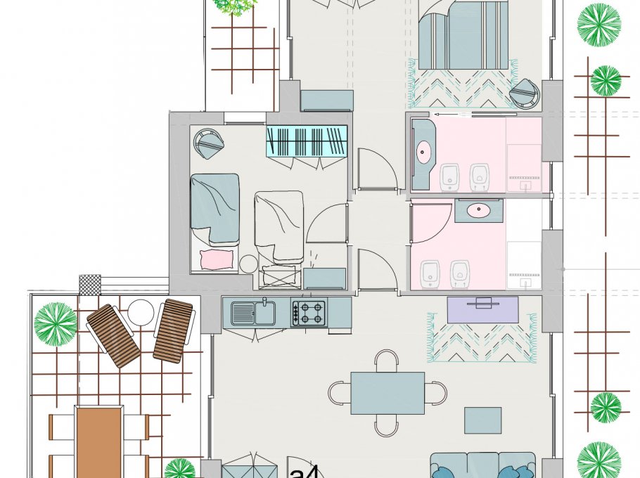THREE-ROOM APARTMENT for 4-6 persons, composed of: living room with double divan-bed, kitchen corner, 1 bedroom with double bed and 1 bedroom with 2 single beds, 2 bathrooms, 3 terraces. Air conditioning.