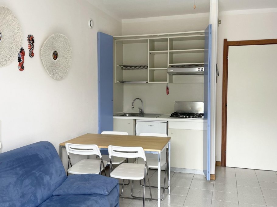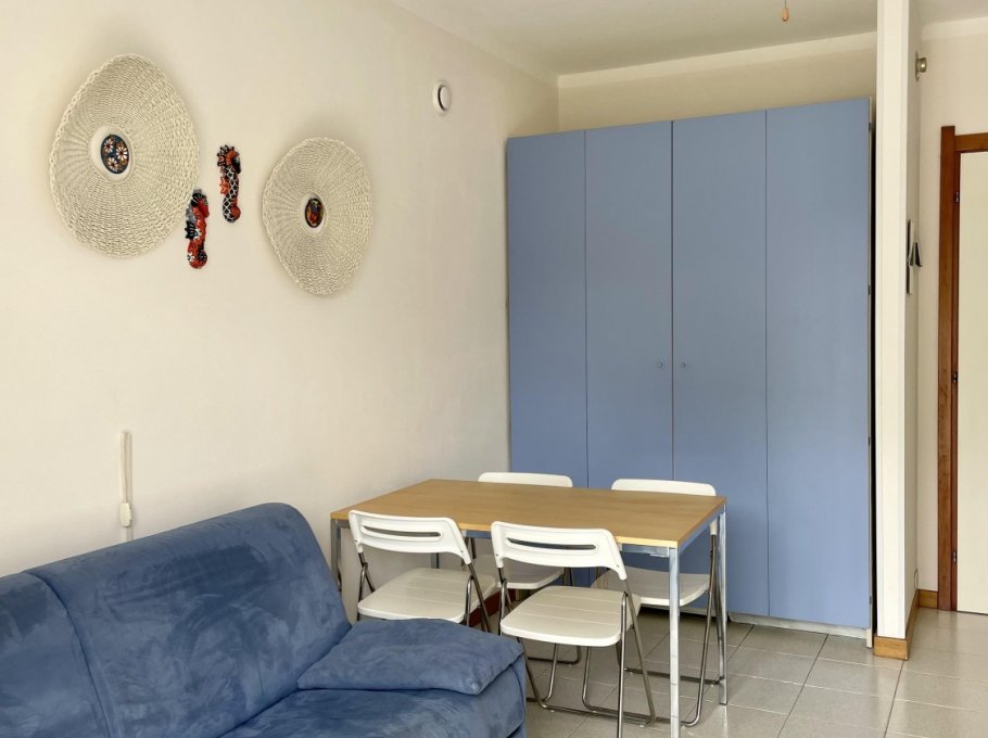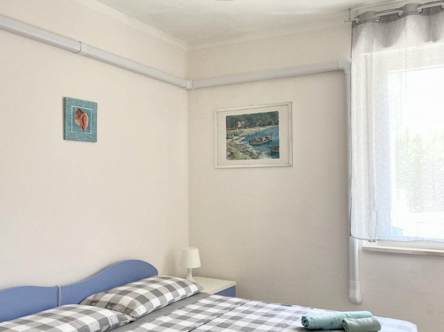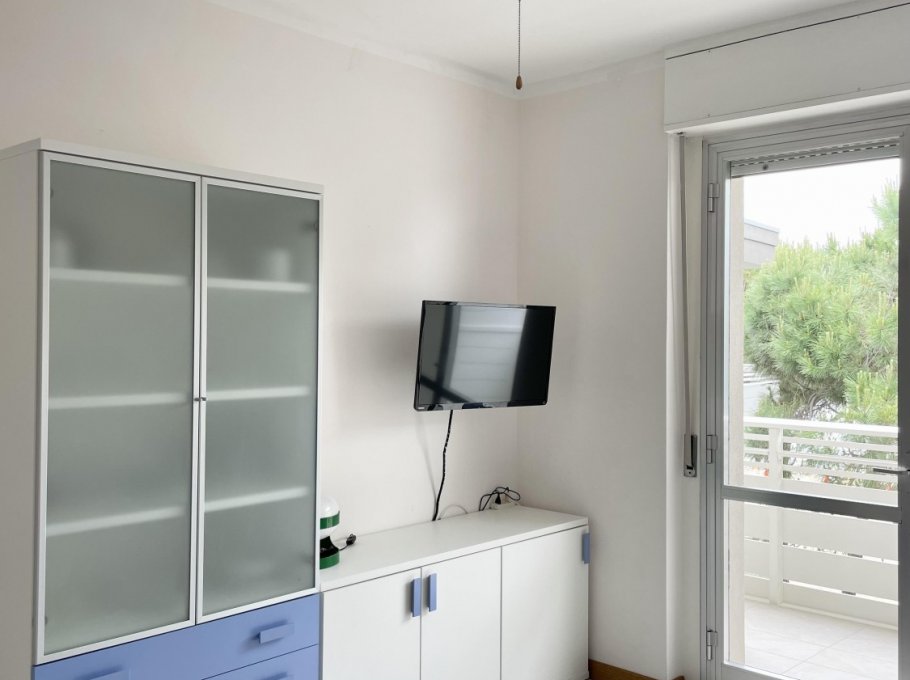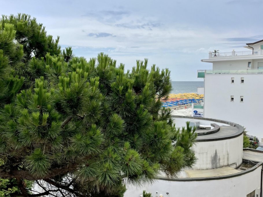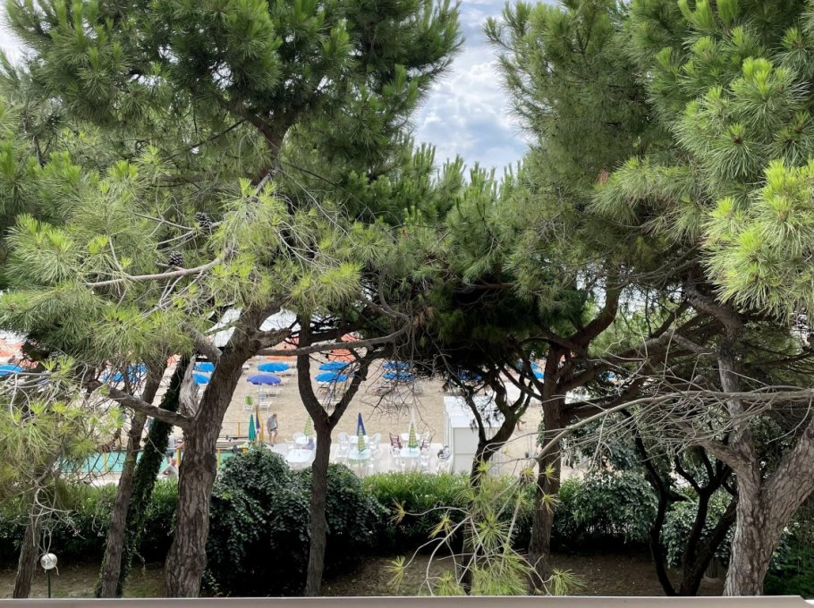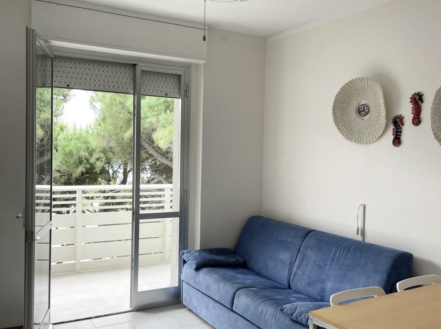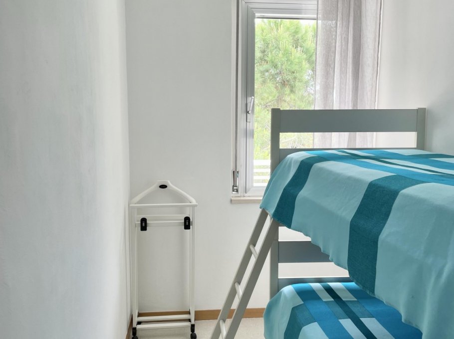 Three-room apartment facing the sea with air conditioning composed of a living room with double sofa bed, kitchenette, TV, bedroom with double bed, bedroom with bunk bed, bathroom with shower cubicle and numbered parking