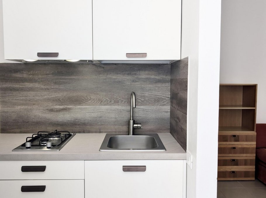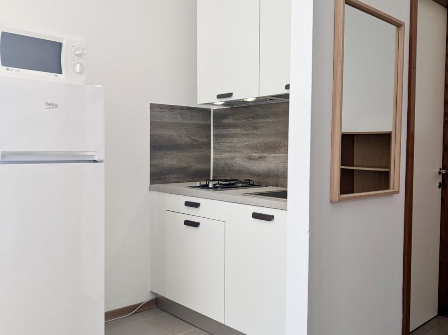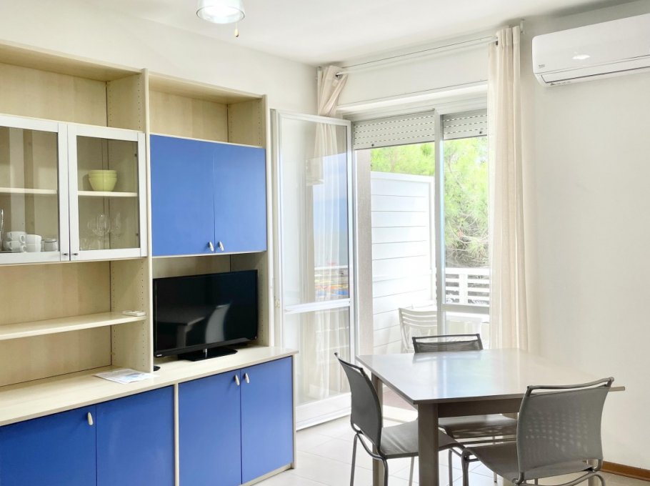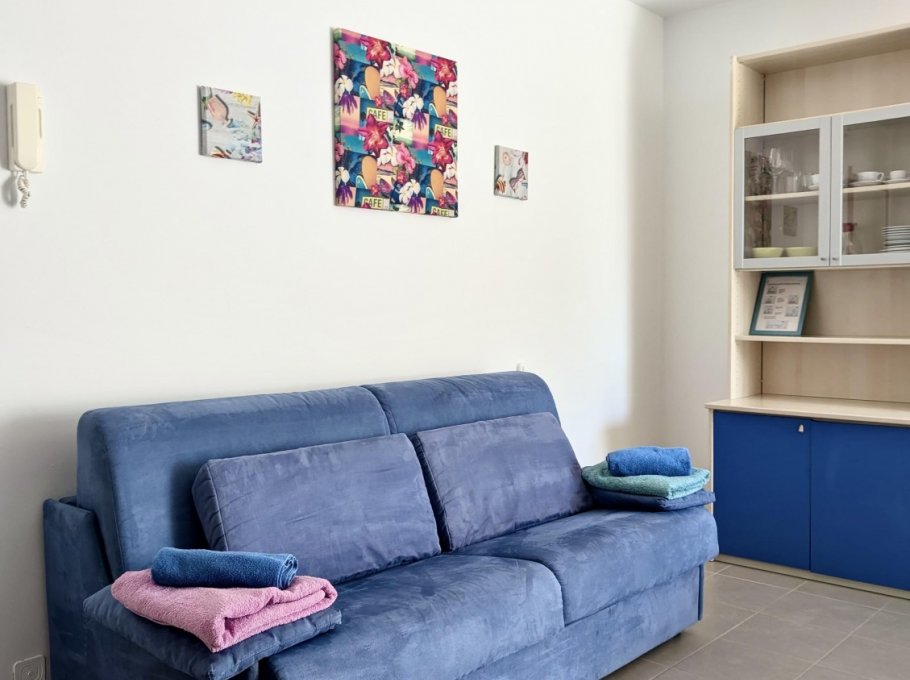 Seafront studio apartment with air conditioning composed of kitchen with double sofa bed and single sofa bed, TV, bathroom with shower cubicle, terrace and numbered parking space.