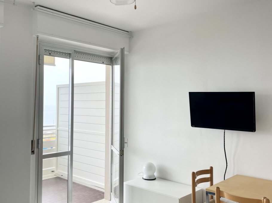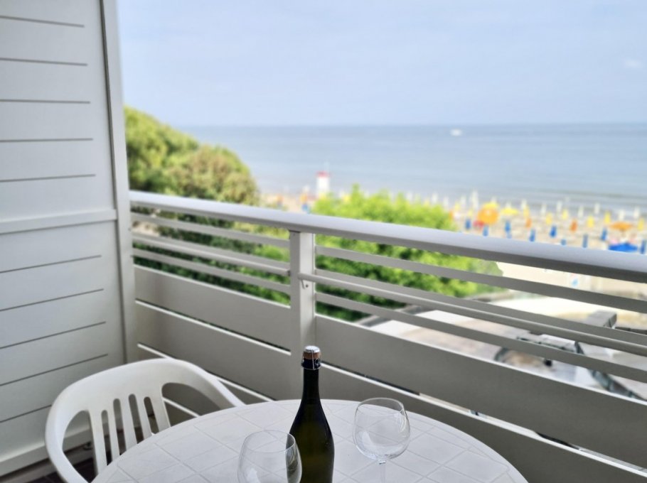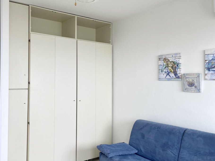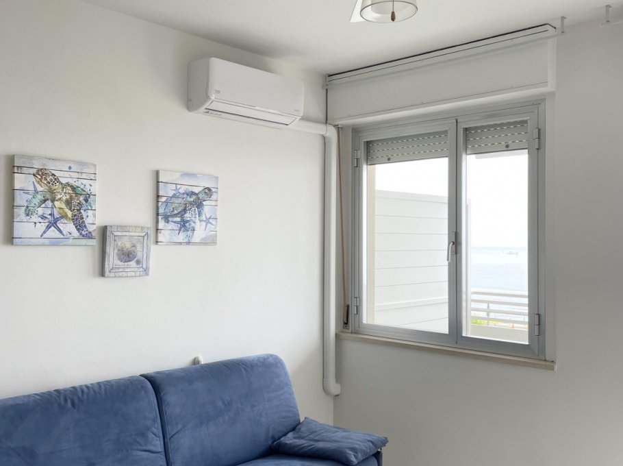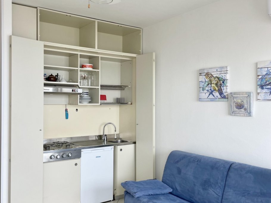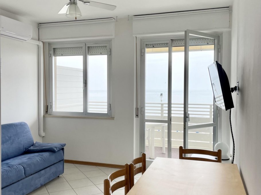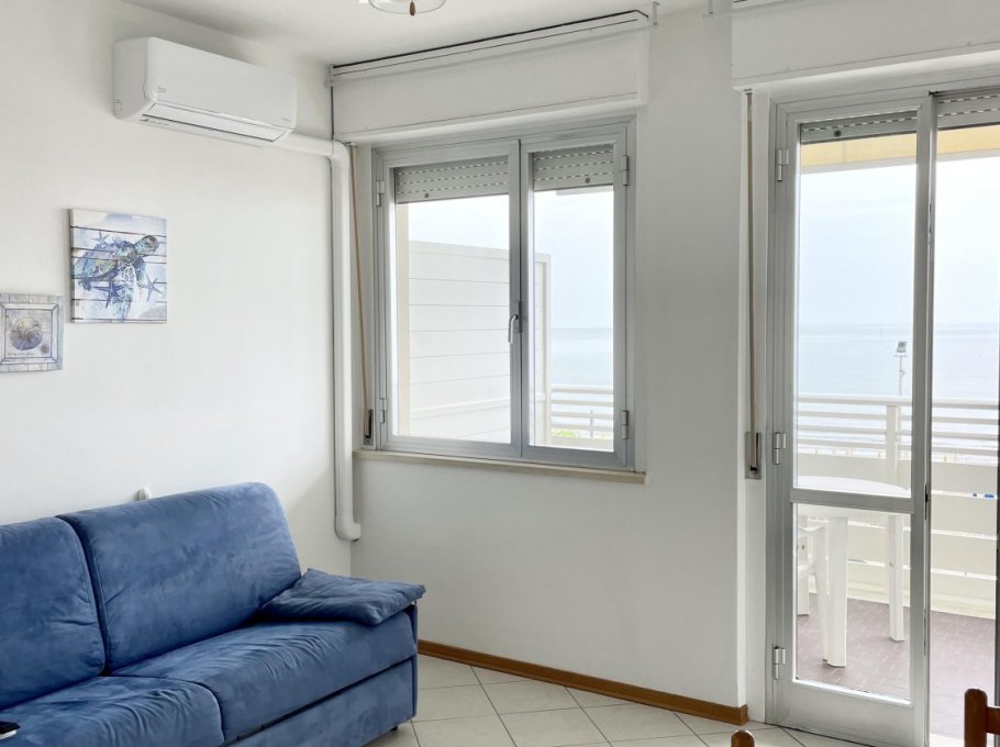 Seafront studio apartment with air conditioning composed of kitchen with double sofa bed, TV, bathroom with shower, terrace and numbered parking space.