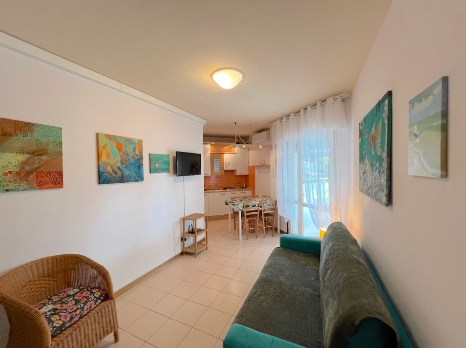 Two-room apartment on mezzanine floor with living room with open kitchen , double sofa bed and access to small terrace, 1 double bedroom with access to small terrace, bathroom with shower box, 1 assigned parking space (sleeps 2/4).